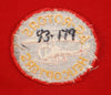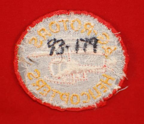 Round patch, 2 3/4" across, gray cloth backing with red thread outer border and words, in yellow, AG - ROTORS HELICOPTERS, and a white helicopter outlined in red centre. AG- ROTORS is a company that is related to Bell Helicopters so I feel this likely a patch from them. Used, was sewn on with treads remaining. White gauze type cloth backing. Number 93-179 in black ink on back.