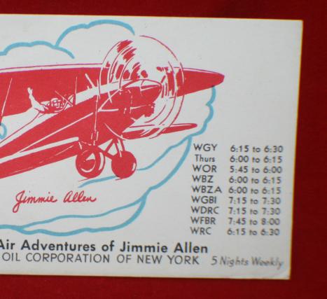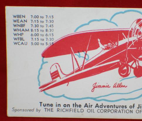 Jimmie ALLEN Radio Station listings, early 1930's era, card. 3" x 5 3/4", colored, showing Radio Stations and Times for the show. Sponsored by the RICHFIELD OIL CORPORATION OF NEW YORK. Shows age dulling but still quite nice.