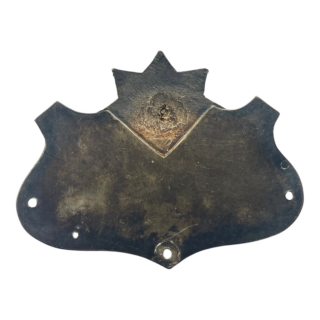Two piece design, with cast Canadian Rifle League emblem attached the heavy silver plated crest. Engraved 1919 SECOND PLACE / WON BY / 448TH REGIMENT (HIGHLANDERS). Crest has holes drilled to apply to trophy. Regrettably, there is a scratch running along the right side.