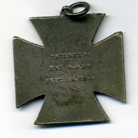 USA. GRAND ARMY OF THE REPUBLIC, WOMENS RELIEF CORPS, Medal, 4 armed Cross, 30mm across, top loop for suspending from ribbon, no ribbon. On one side, words, WOMENS RELIEF CORPS 1883 on each arm and Stars on circle inner banner and Figures with soldiers and children in centre and on other side words, PATENTED/MAY 4 & SEPT. 28. 1886. Shows age darkening of the silver/white metal medal. Excellent detail only showing slight wear to high spots. Nice.