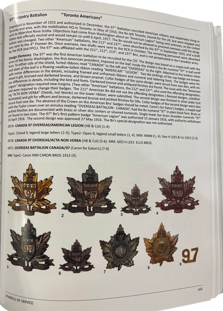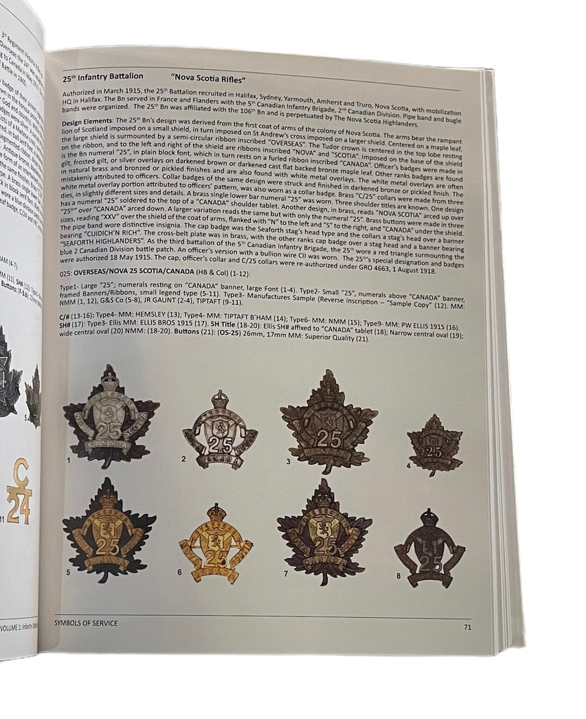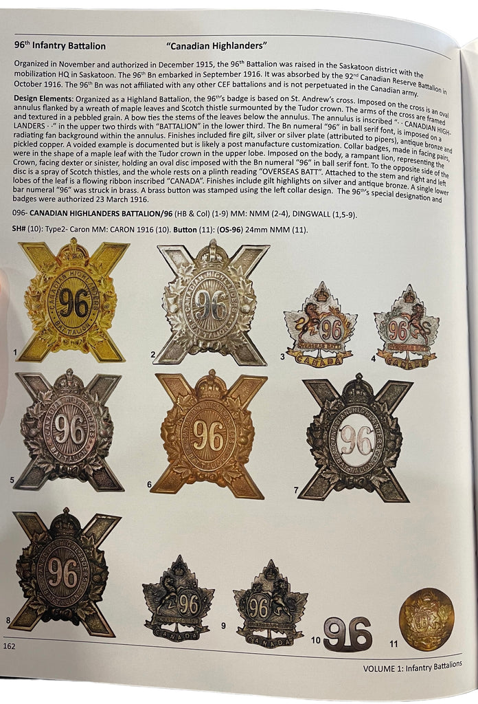 Hard cover, 360 glossy pages with a brief history of the Battalion, design variations and all badges in full size and in colour. Covering known badges and variants of the Infantry Battalions of the CEF. No other book covers the topic as well as this book does. A new standard for collectors. Includes an easy to navigate Table of Contents.