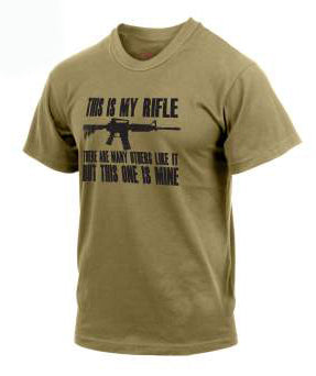 "This Is My Rifle" T-Shirt is inspired by the USMC Rifleman's Creed (also know as My Rifle and The Creed of the United States Marine). The comfortable, yet durable Cotton/Poly T-Shirt features a printed rifle design with the infamous USMC quote "This Is My Rifle There Are Many Others Like It But This One Is Mine". In Coyote.