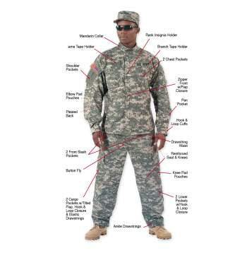 Army Combat Uniform Camo Pants are constructed with a cotton poly rip stop fabric for added strength and durability. The army uniform pants are made to near-military specifications (Mil-Spec).