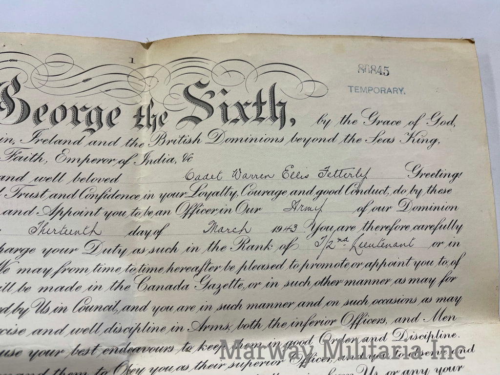 A nice grouping. Commission scroll dated March 1943, with picture of Cadet Warren Ellis Fetterly of Nova Scotia. Card came with commission, assuming it's him. Stain on lower centre of document. No research completed. Folded.