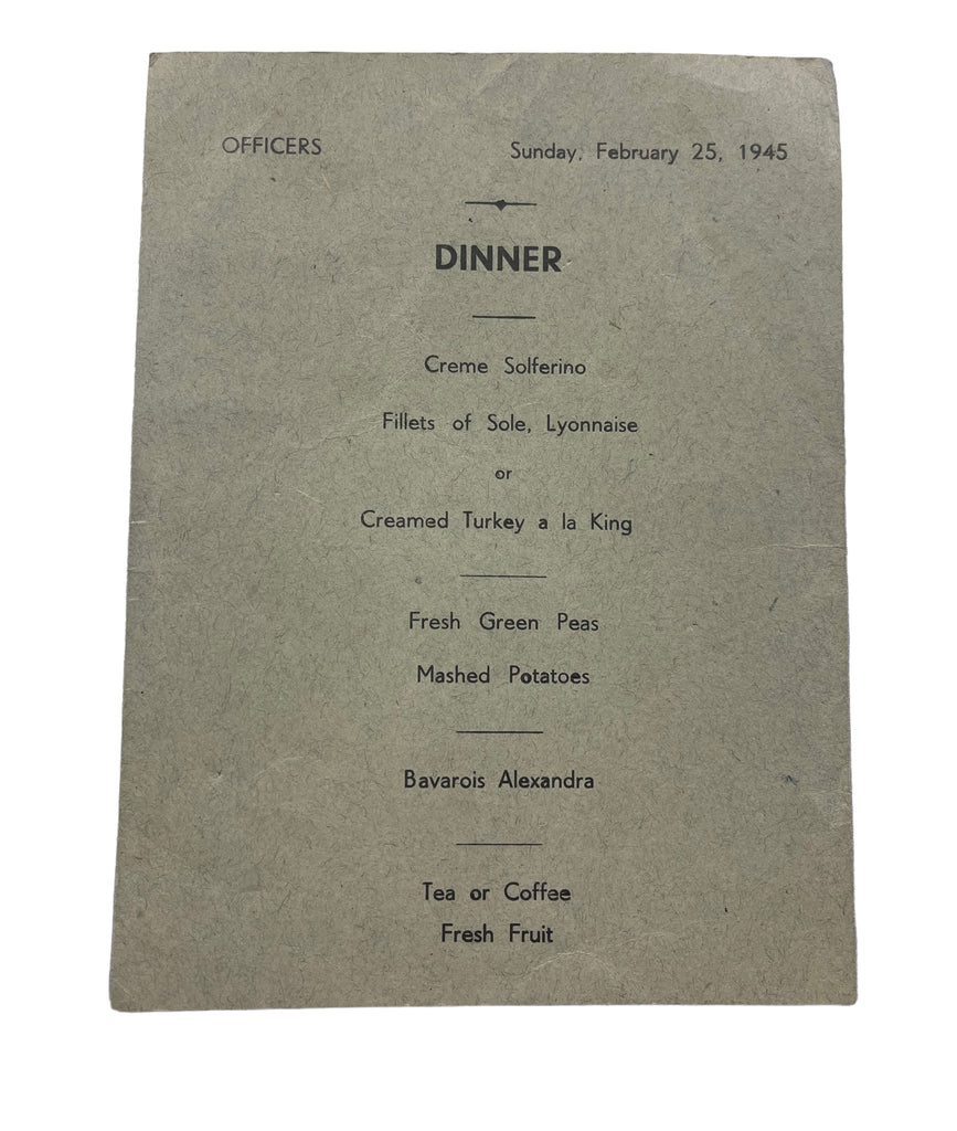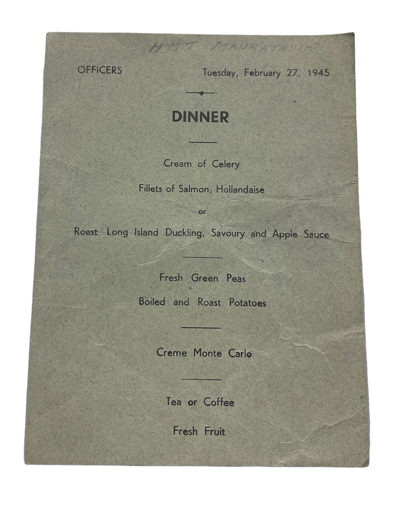 A grouping of 3 rigid card stock of menus on HMT Mauretania. Each with consecutive dates, Feb 25, 26 & 27. Two dinner one lunch.