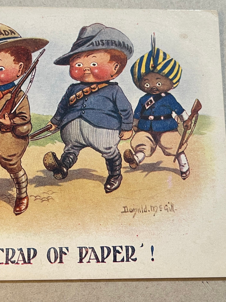 Shows 4 marching "soldiers", representing South Africa, Canada, Australia, and India. Corners rounded, not postally used.