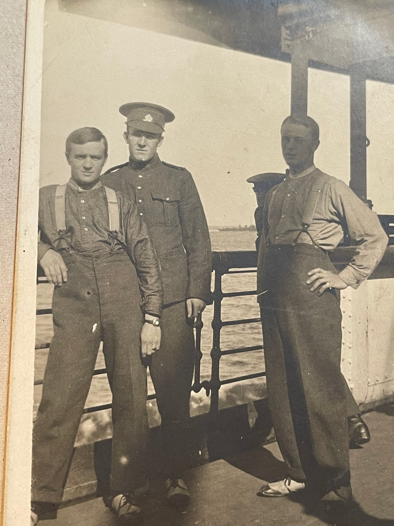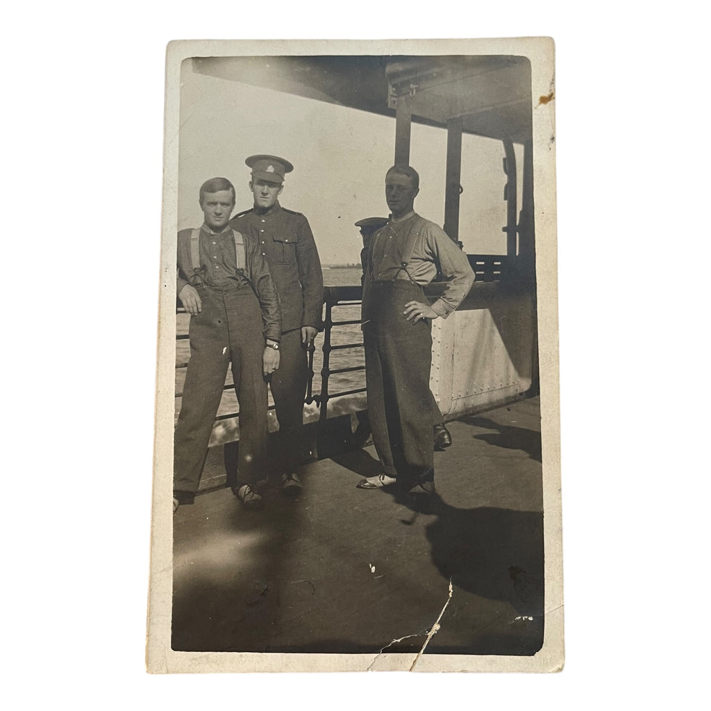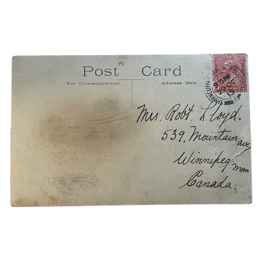 Shows four soldiers on boat, one in full uniform. Cancellation from Shorncliff Camp in the UK, addressed to Winnipeg. Tear at bottom.