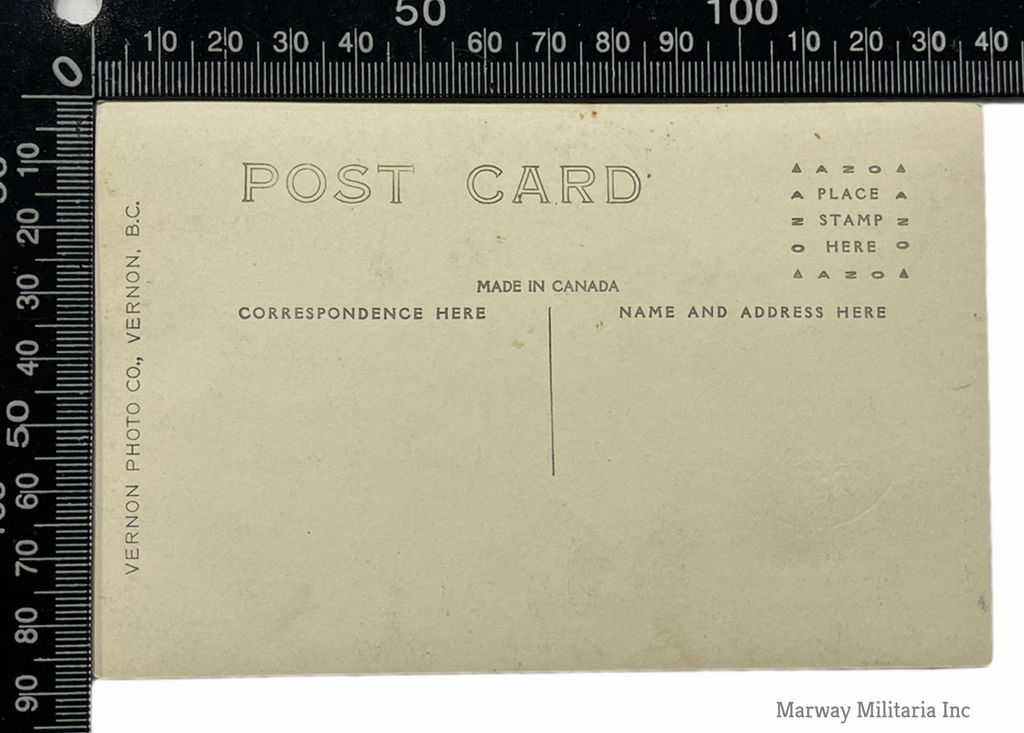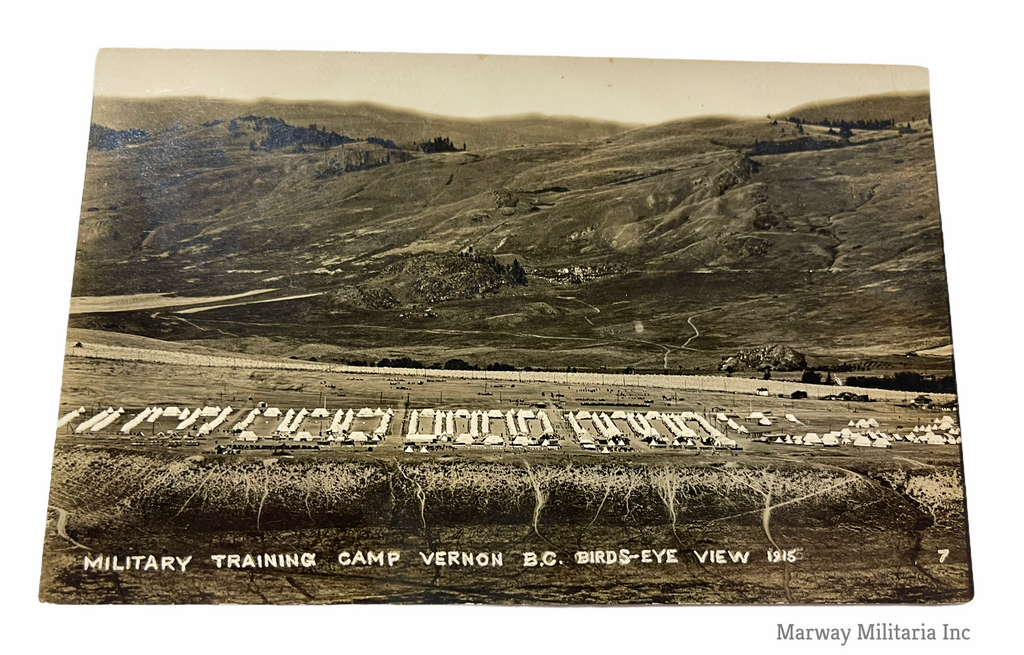 B&W postcard showing the Birds Eye View of the camp at Vernon with rows of tents. No markings on the back.
