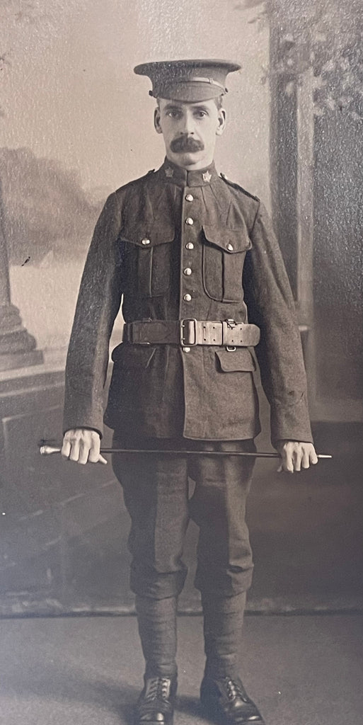An unused post card showing standing soldier, General Service Insignia, wearing 7 button tunic..