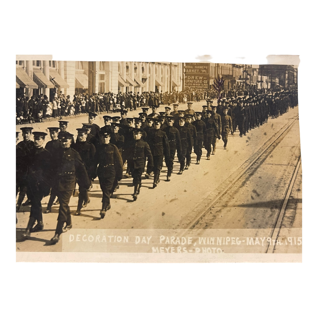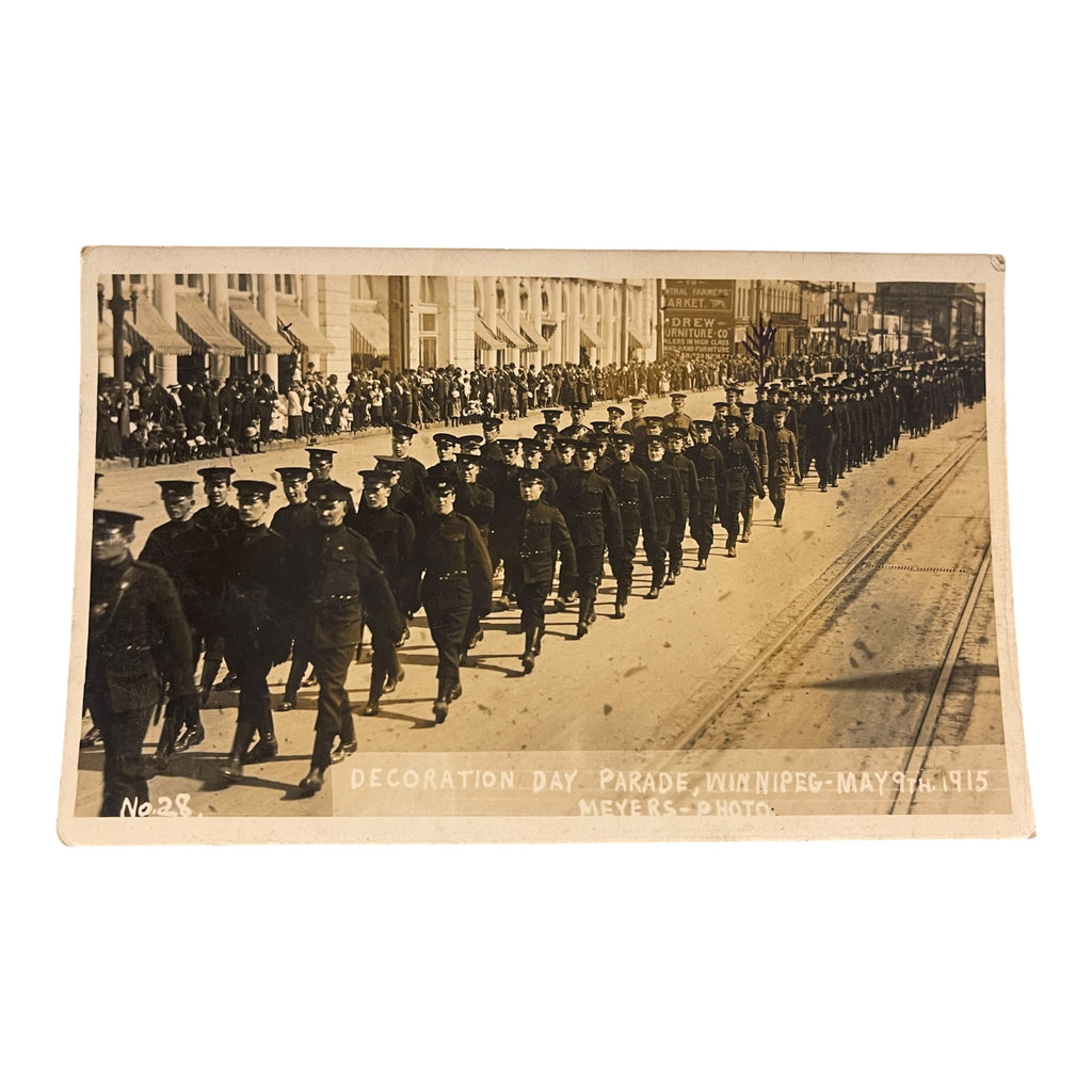 An unused post card showing Decoration Day in Winnipeg Parade. May 9th, 1915. Hand written note on reverse, and ink arrow pointing to soldier. Should be able to research this one.