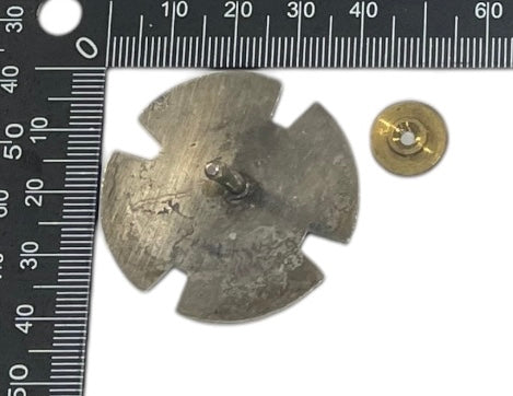 Heavy well made pewter badge with red enamel. Screw post fastener.