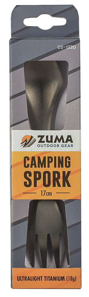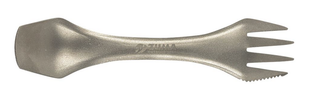 When you need a lightweight high strength metal, Titanium is the obvious choice. It is as strong as steel but only half its weight, it resists corrosion and will provide years of trouble-free service. The SPORK is a hybrid utensil that provides all the functionality of a spoon, fork, and knife in one compact design. The ZUMA Ultralight Titanium Spork is an ideal choice for backpackers or survivalists where lightweight durability is a necessity. Box measures 7.25"L x 2"W x .75"H. Weighs .10 lbs.