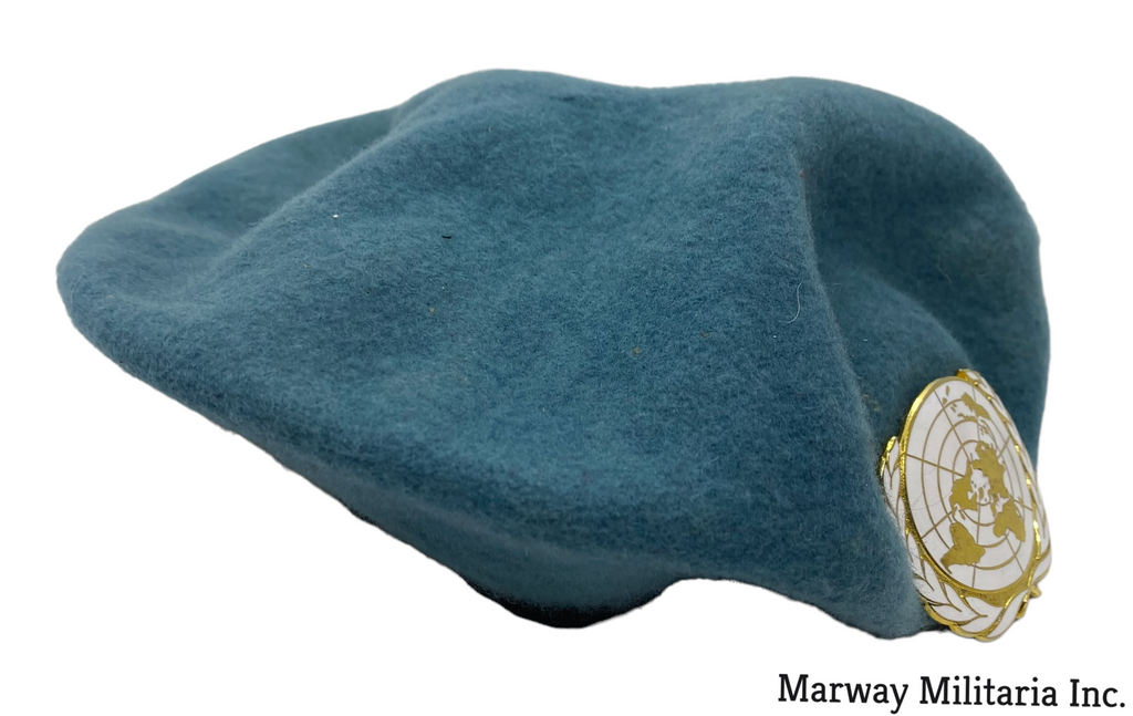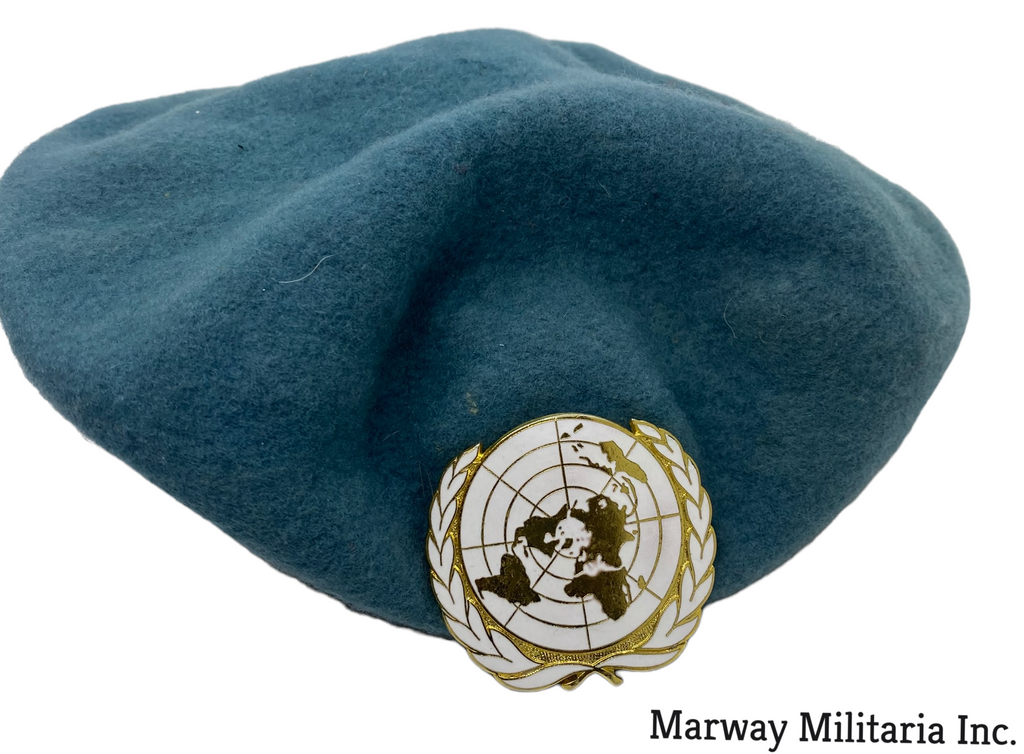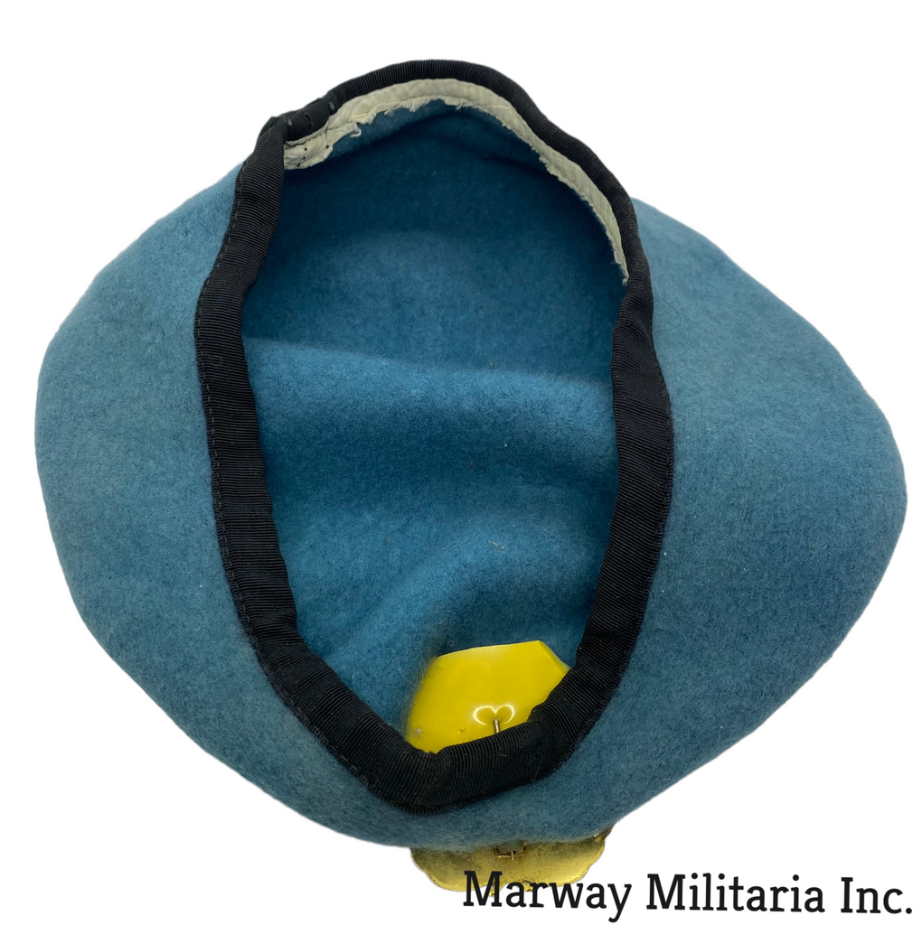 Un Blue wool Beret with enamel and metal badge. Liner removed. Shows use and wear.