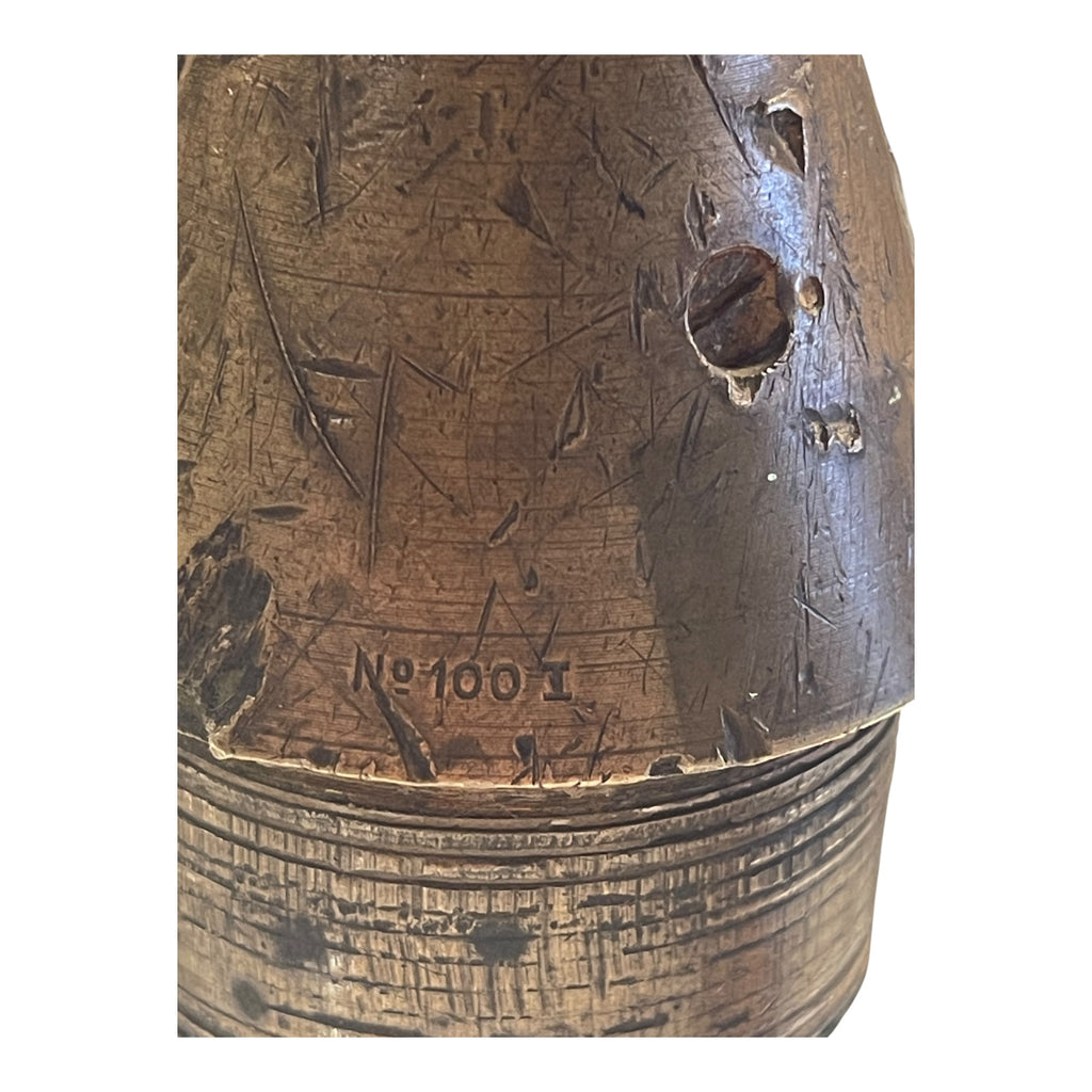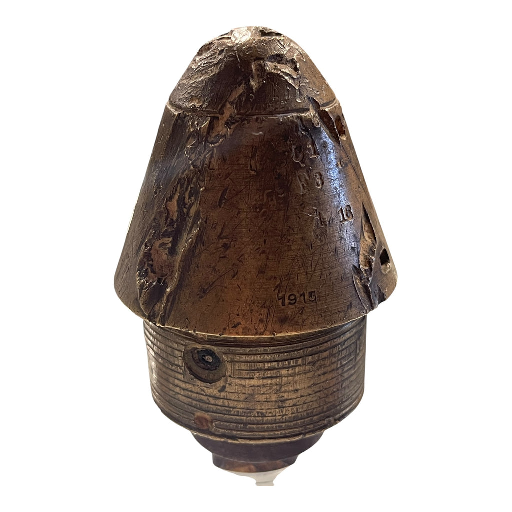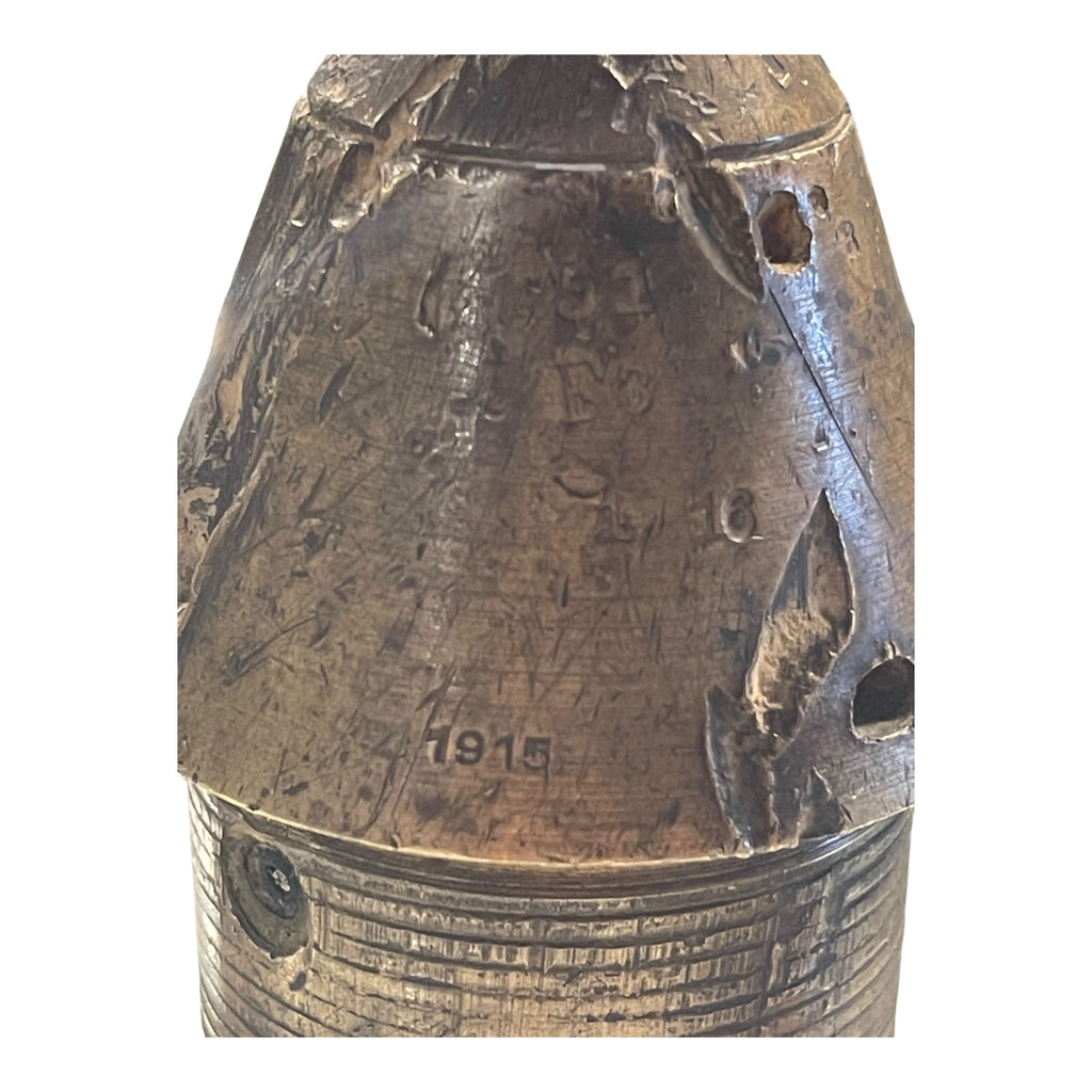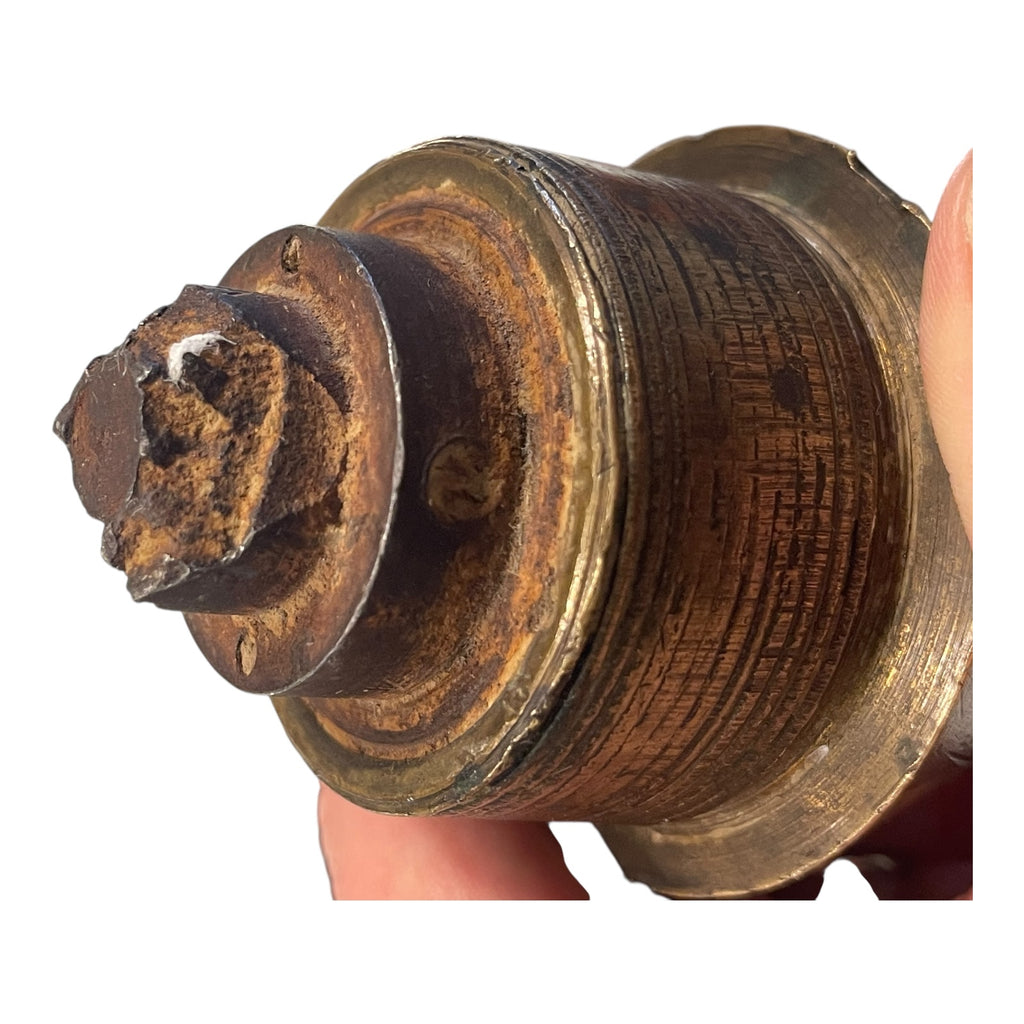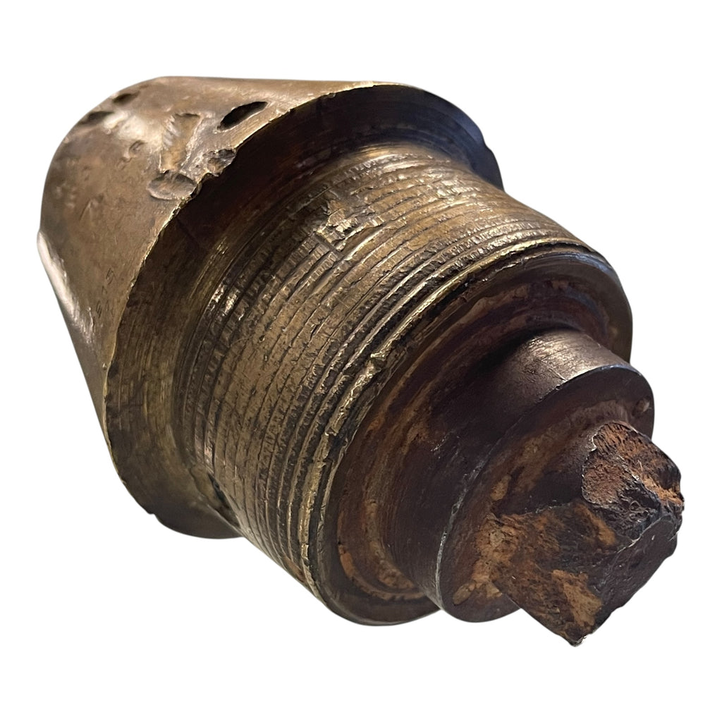 Brass, and quite heavy! Numerous markings, including no 100, 1915, G2, F3. Numerous dings and dents and gouges.