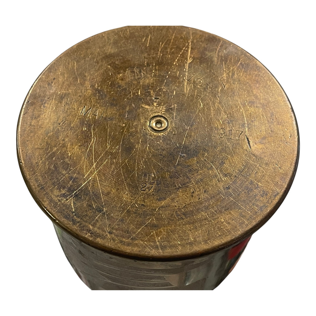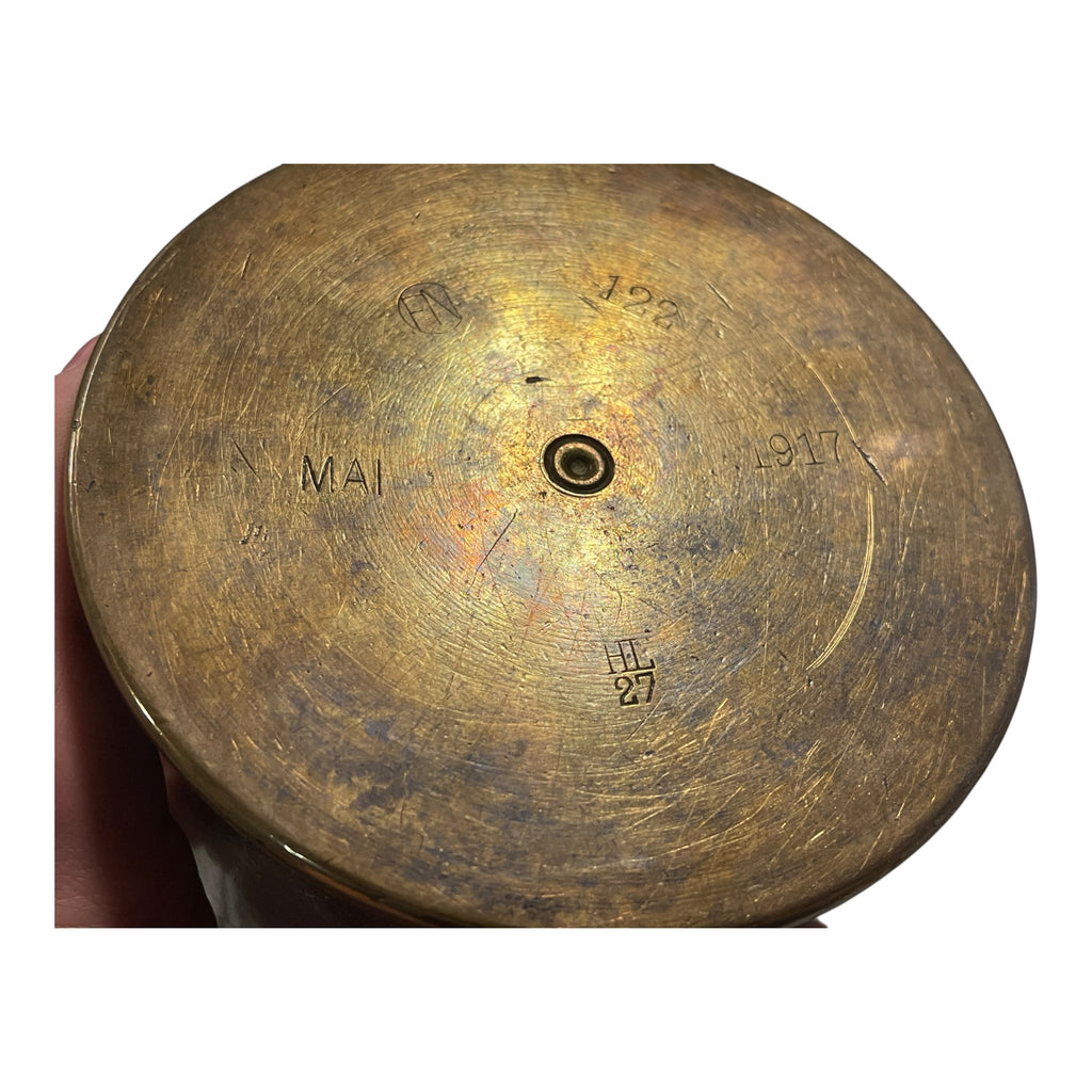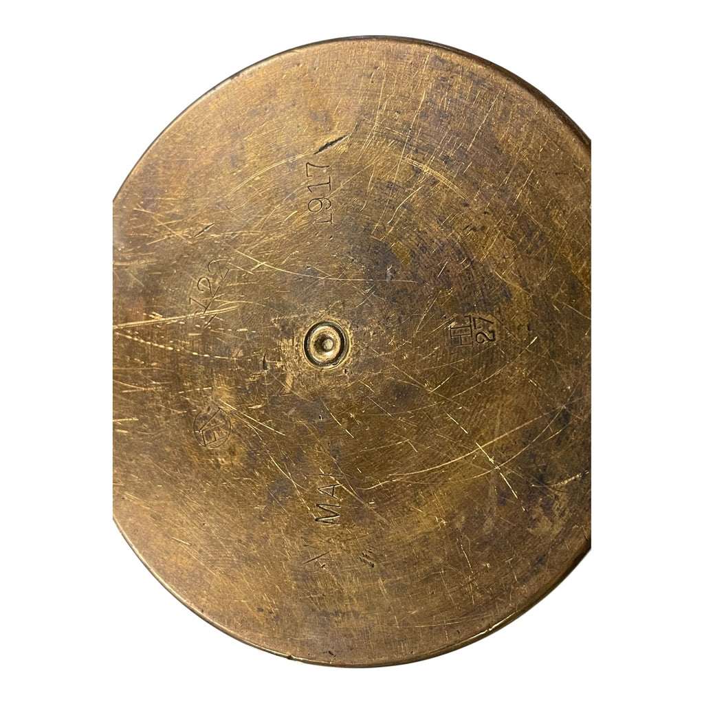 Unknown model. Dated Mai 1917 , numerous other stampings 122, HL over 27 (Haniel Luge Dusseldorf), FN (Friedrich Neumeyer Nurnberg). Width of case is 113mm (at open top). Polished at one time. Has tape residue remaining. A few mouth dings. Nice markings on the base.