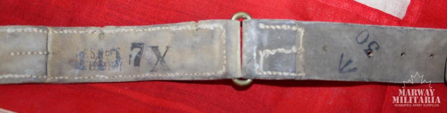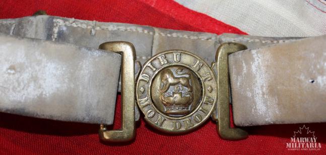 Most of the whitening has come off the white belt. Brass Victorian crowned buckle (well polished), with brass hardware. Stamped in leather A & S. H. of C REG'T PROPERTY. Stamped in ink 7 X, and Arrow with 30. Well made, not often offered.