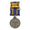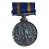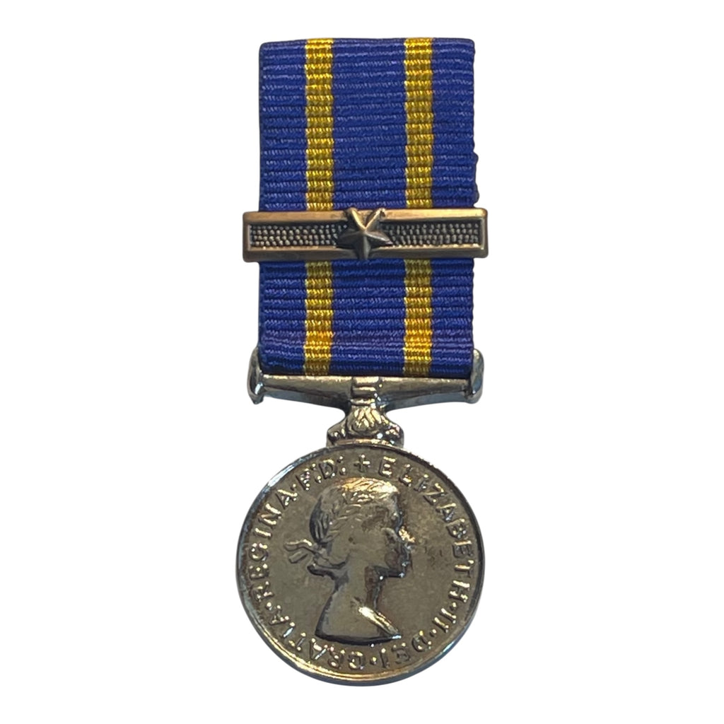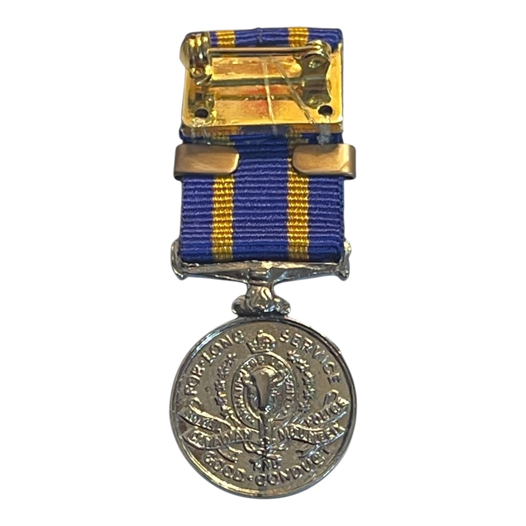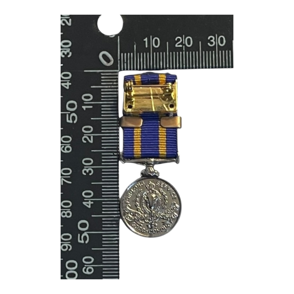 A mini size replica with ribbon. Plated. This is the first issue Eliz, and the earlier KC crest on the obverse. With 25 year service bar.