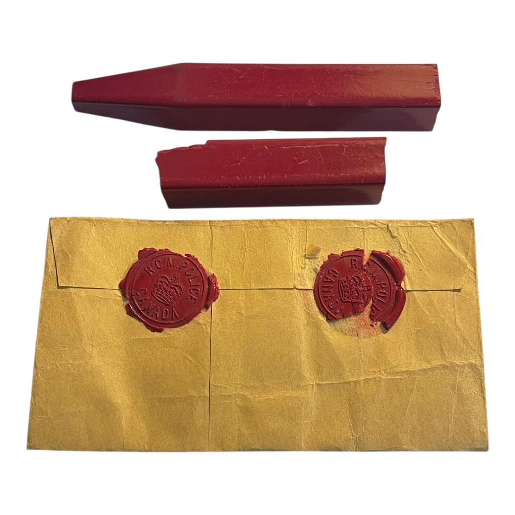 Lot of 5 items. Includes a Kings Crown and Queens Crown stamp, each marked R.C.M POLICE over Crown over CANADA, each the same, except for the crowns. Two pieces of wax, and a piece of envelope marked Lac du Bonnet with wax seal stamps.