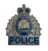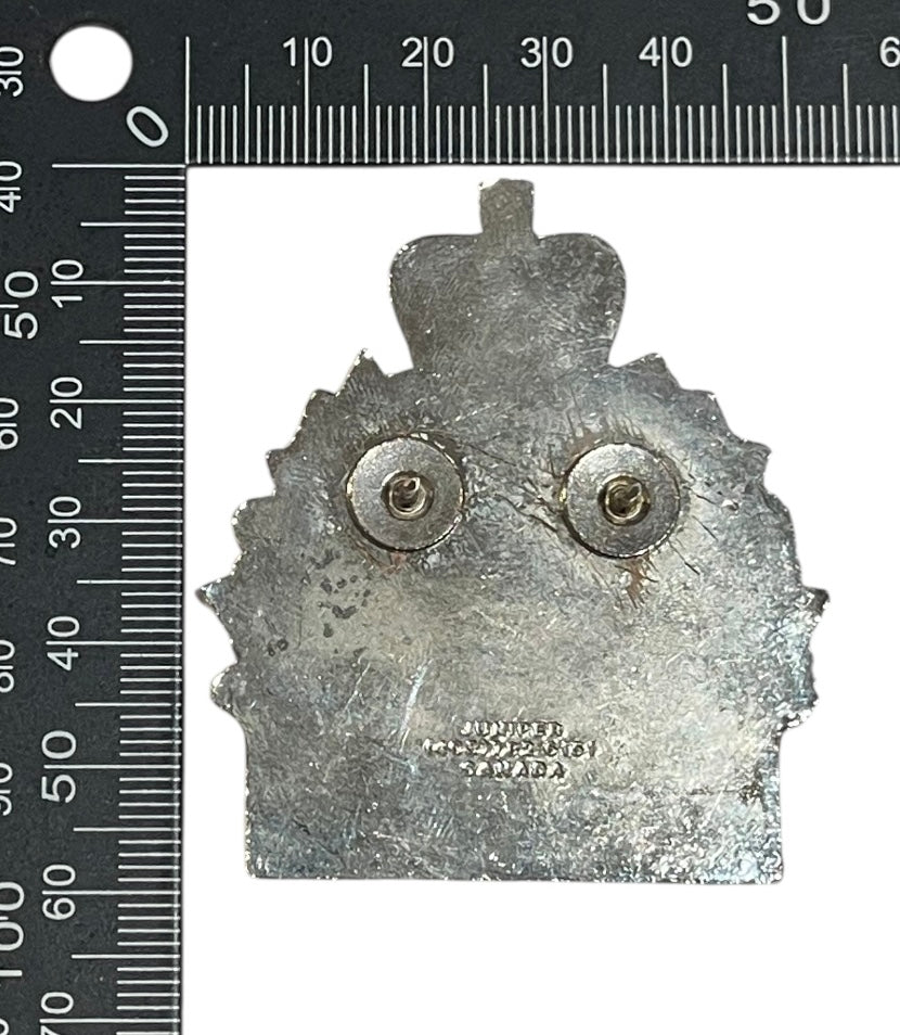 White chrome metal with blue enamel. Clutch Pin fasteners.