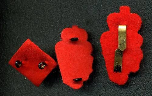 Royal Ulster Constabulary Cap, Collar, Rank Pip Lot. All white metal painted black with some white showing due to wear. Cap and collar Queens Crown. Cap 50mm high with folding fasteners and collar 38mm high with lug fasteners. Rank Pip 20mm square. All backed with red cloth. Nice set.