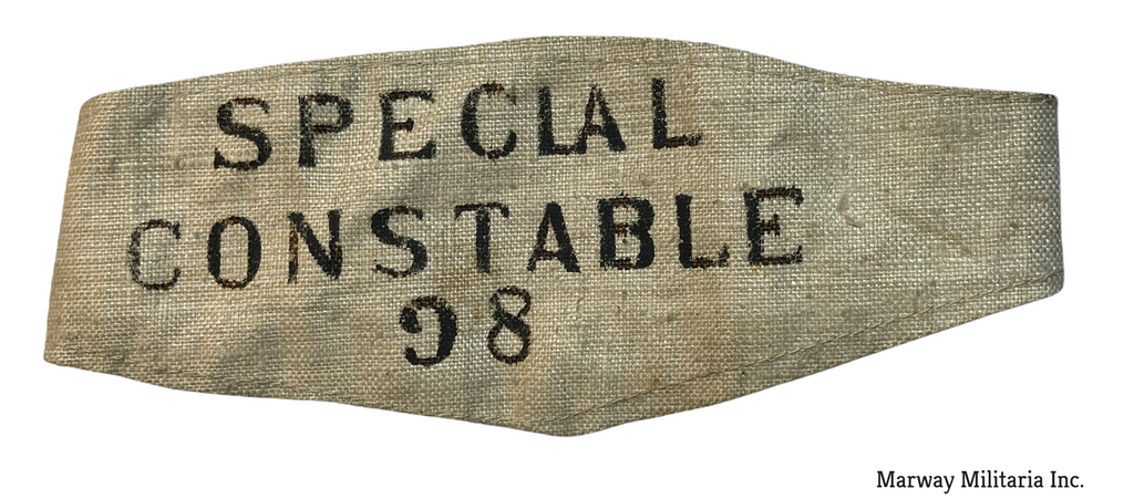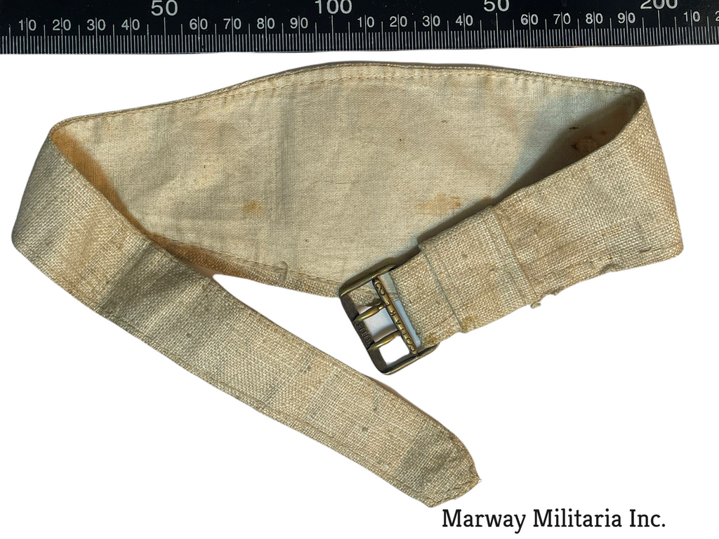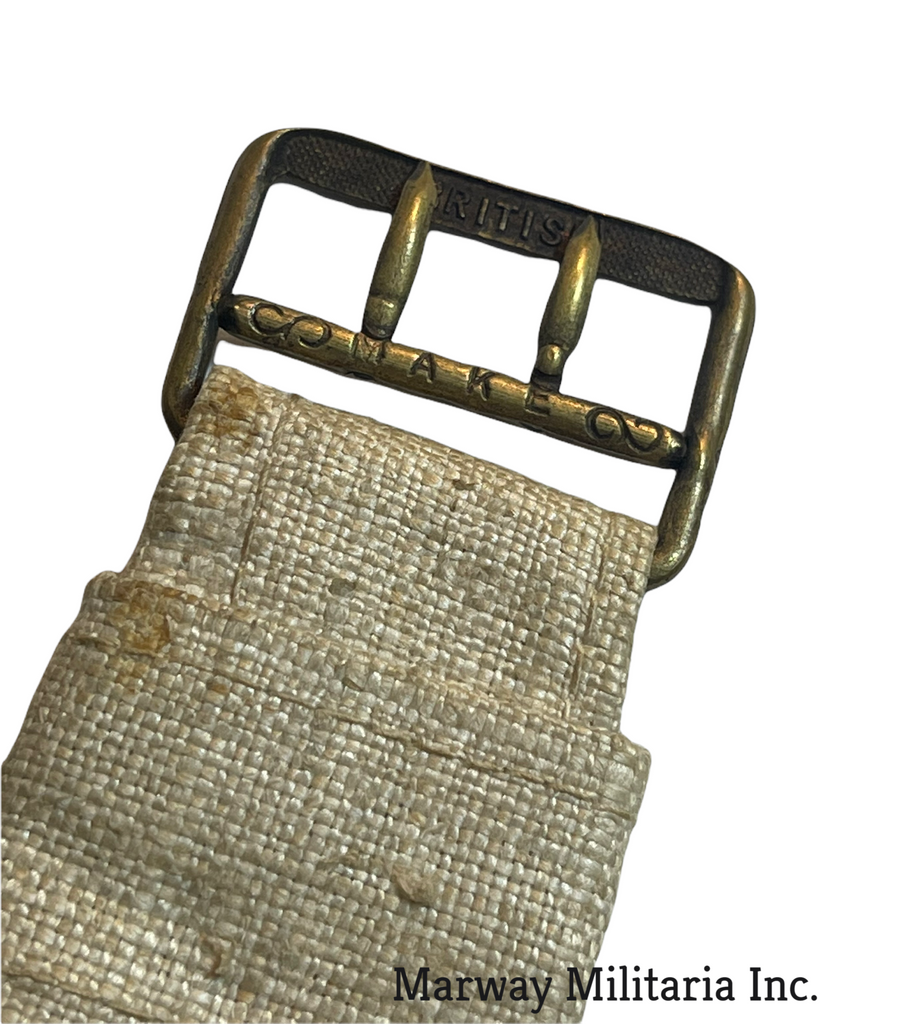 Cotton material, with stenciled lettering. Buckle marked BRITISH MAKE.