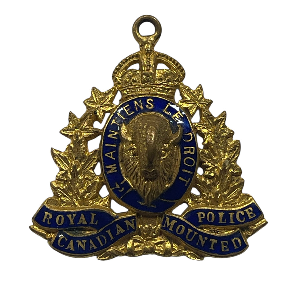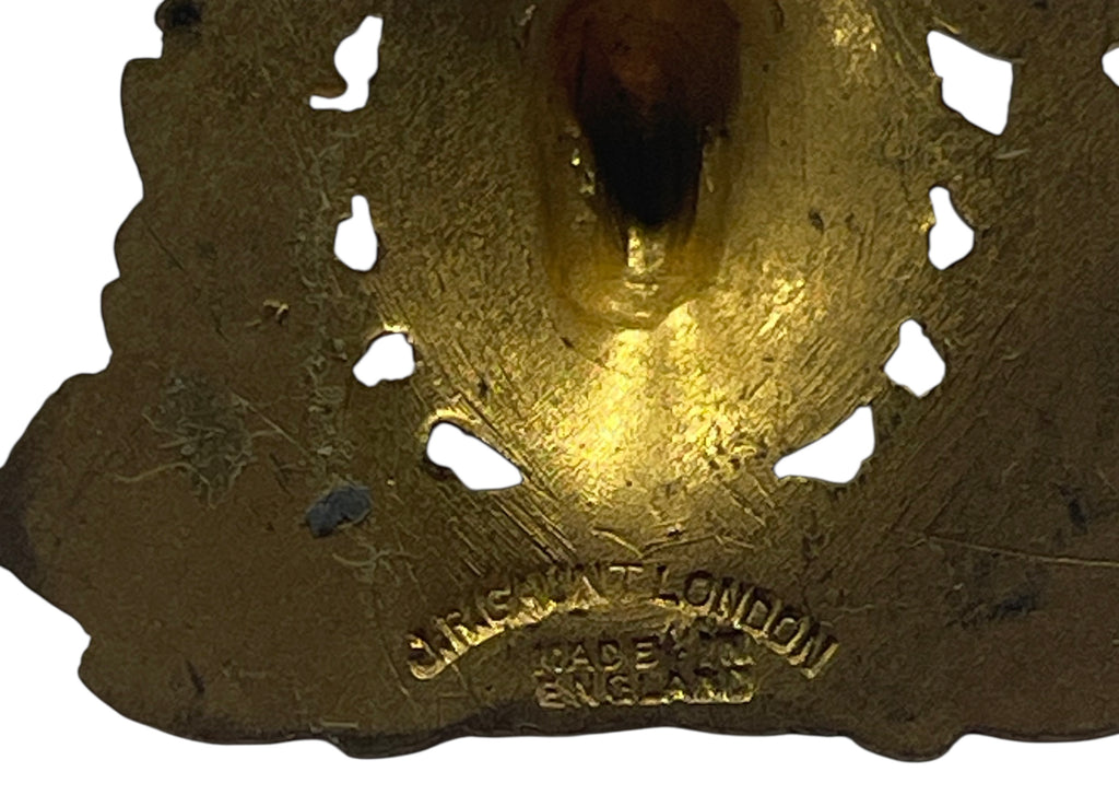 Gold plated brass metal with blue enamels. Nicely maker stamped. Pre 1953, with the Kings Crown. Loop affixed to top to suspend from chain.