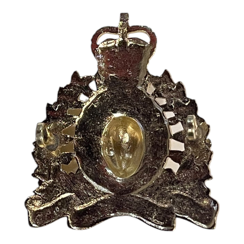 Staybright cap badge for the RCMP. This badge unusual, as it is not maker stamped, as you would normally see (Scully). Lug fasteners. Post 1953.