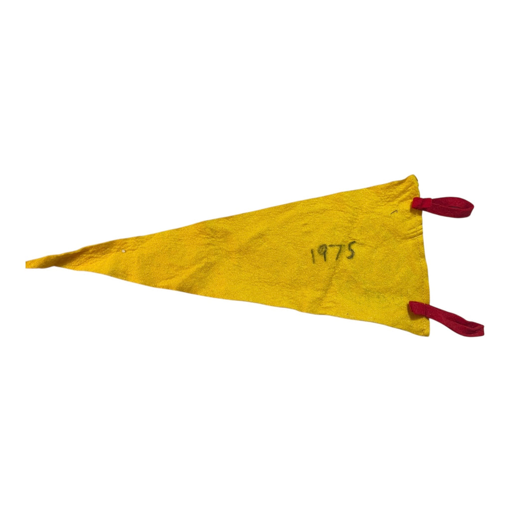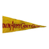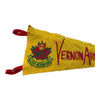 A felt pennant, with screenprinted crest of the cadets with Vernon Army Cadet Camp. Has red tassles on the left end. Some holes from displaying, and a few nips in places. marked 1975 in ink on reverse.