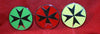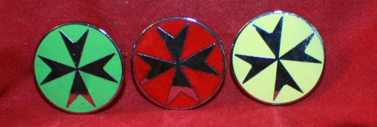 Lot of 3, St. John's Ambulance Junior Efficiency Badge / Special Service Pin. Green 1st Grade, Red 2nd Grade, yellow 3rd Grade. White chrome with coloured enamel. Pin back locking catch. Each maker stamped. 22mm wide.