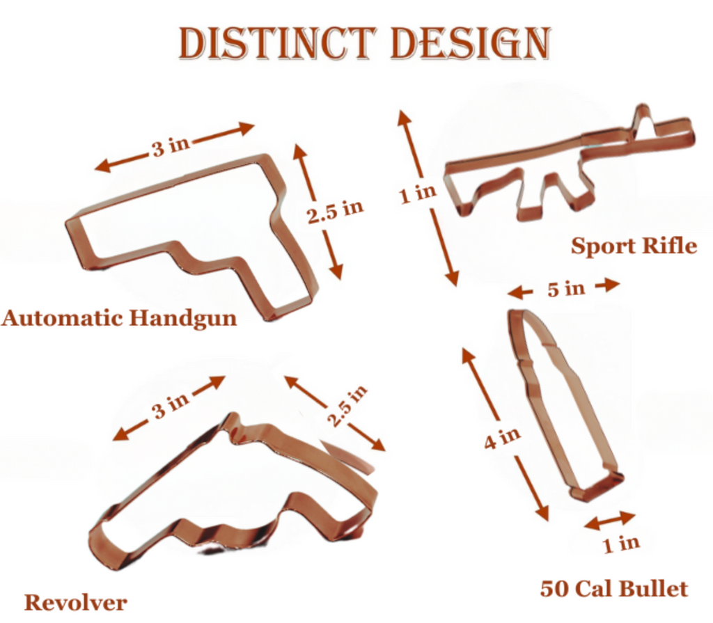 - Makes a Perfect cookie-shaped UZI, Sport Rifle, 50 Cal Bullet, Handgun and a Revolver