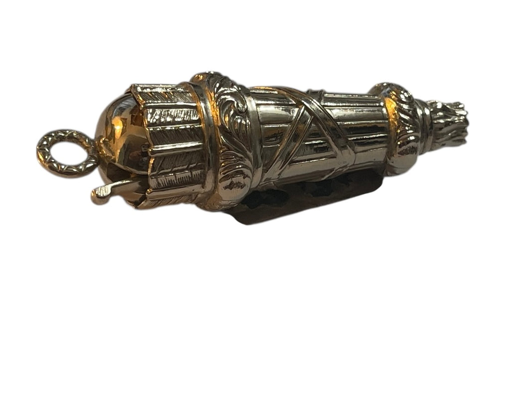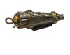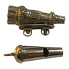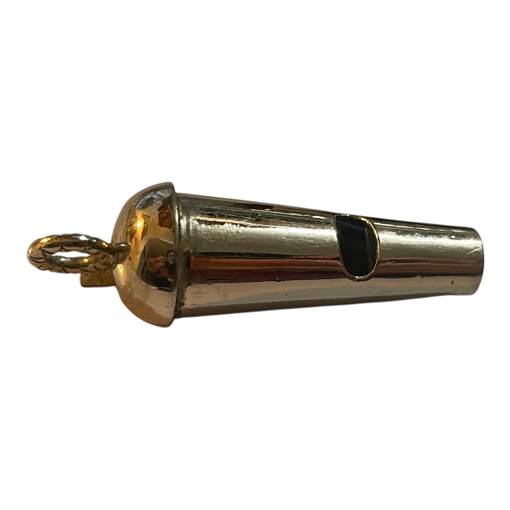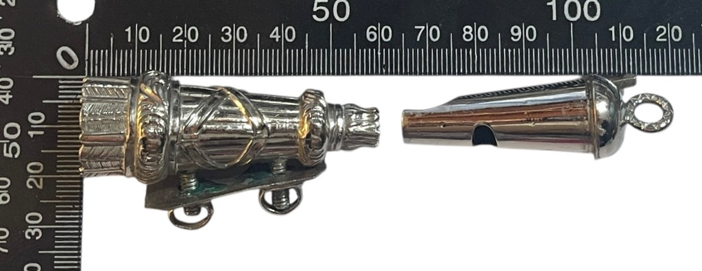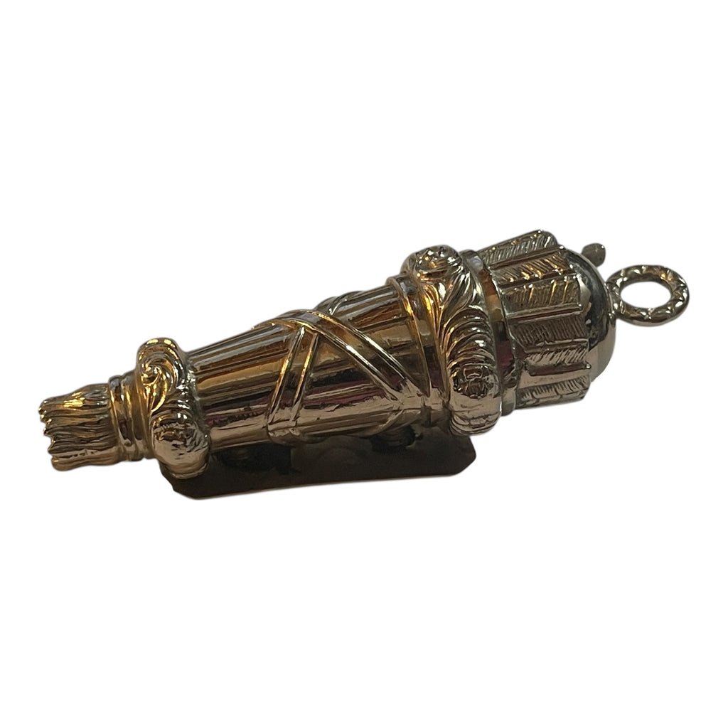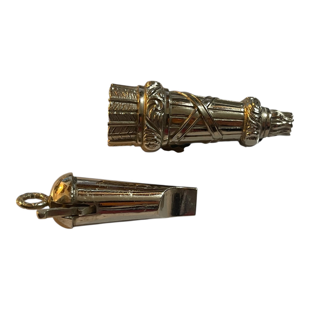Two piece. Chromed metal, with screw posts on the bottom to affix to belt. No markings