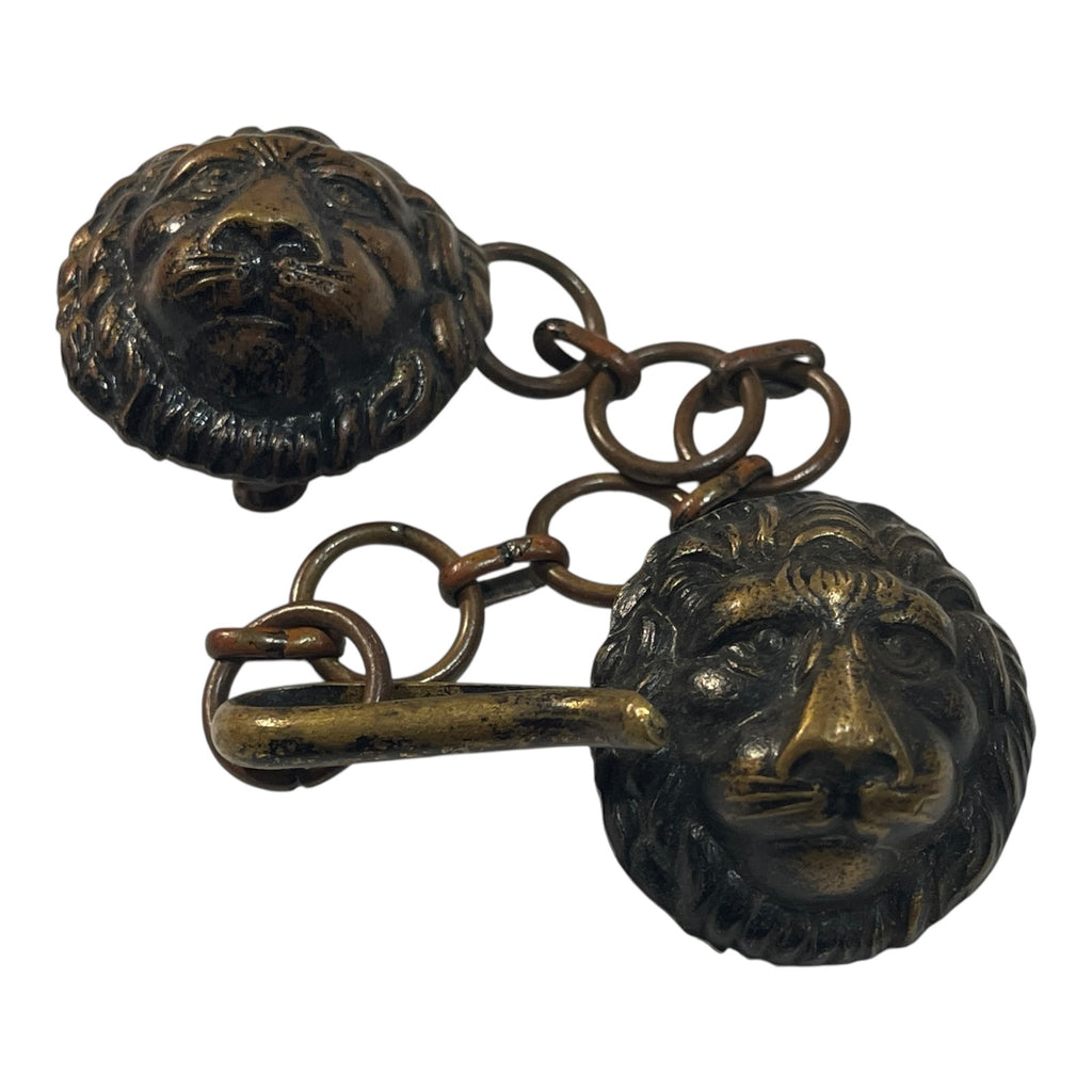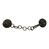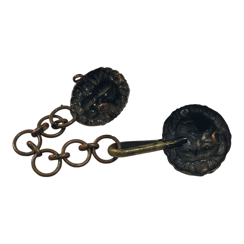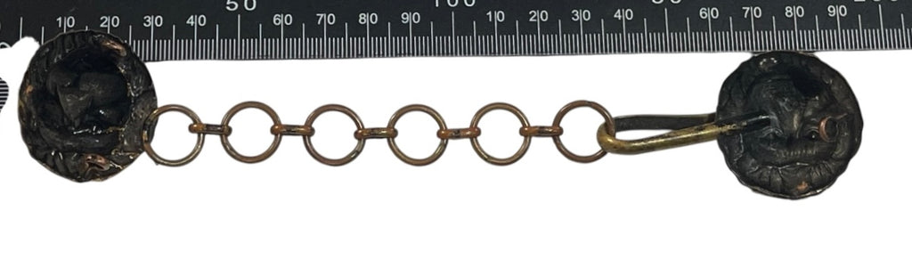 Blackened brass metal with wear showing some brass. One end with a hook to loop links to fasten. These were also used by different groups including British Police services.
