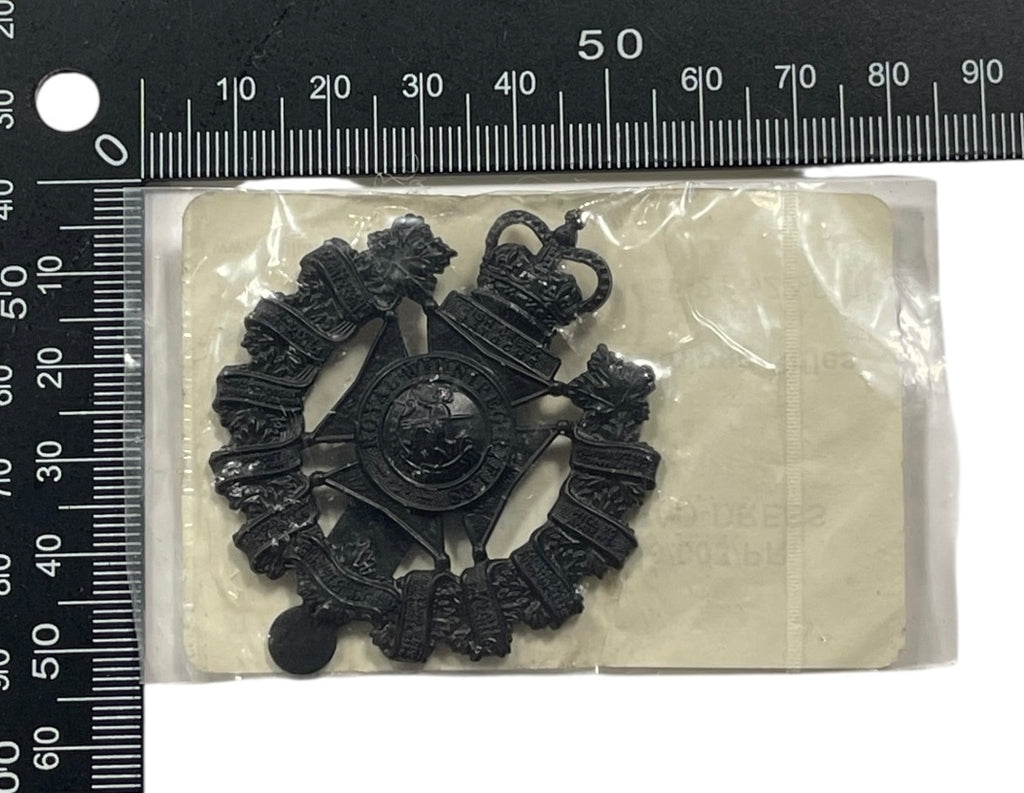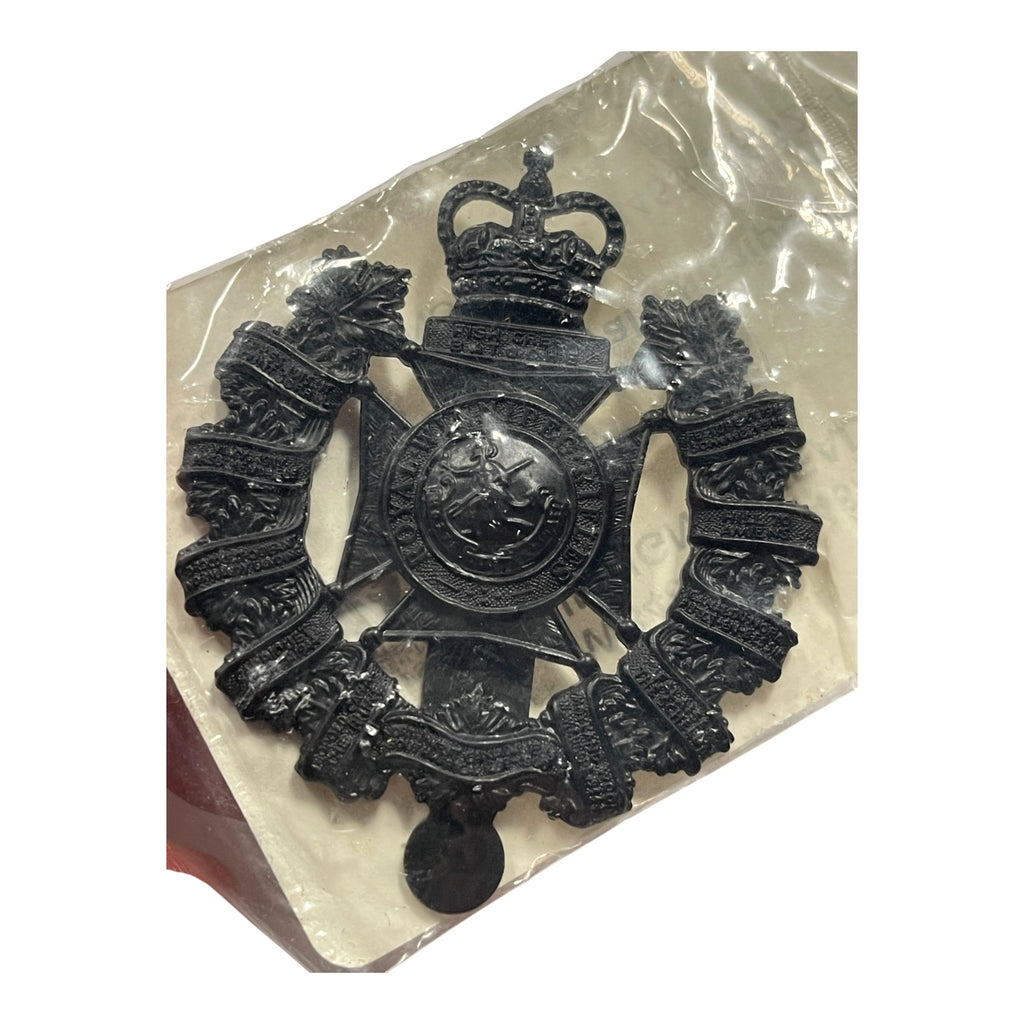 Blacked Cap badge for the Winnipeg Rifles. In Scully packaging. Post 1953.