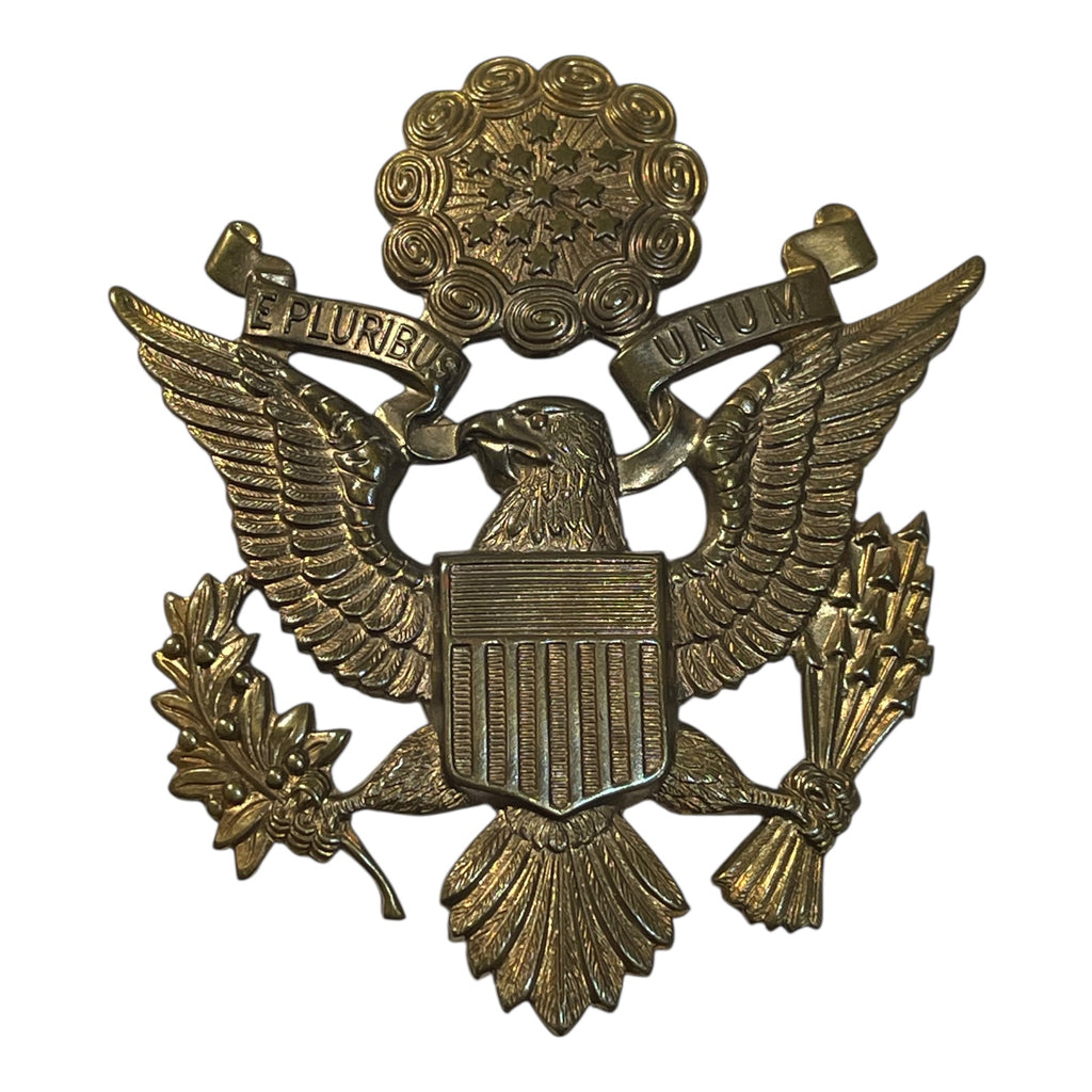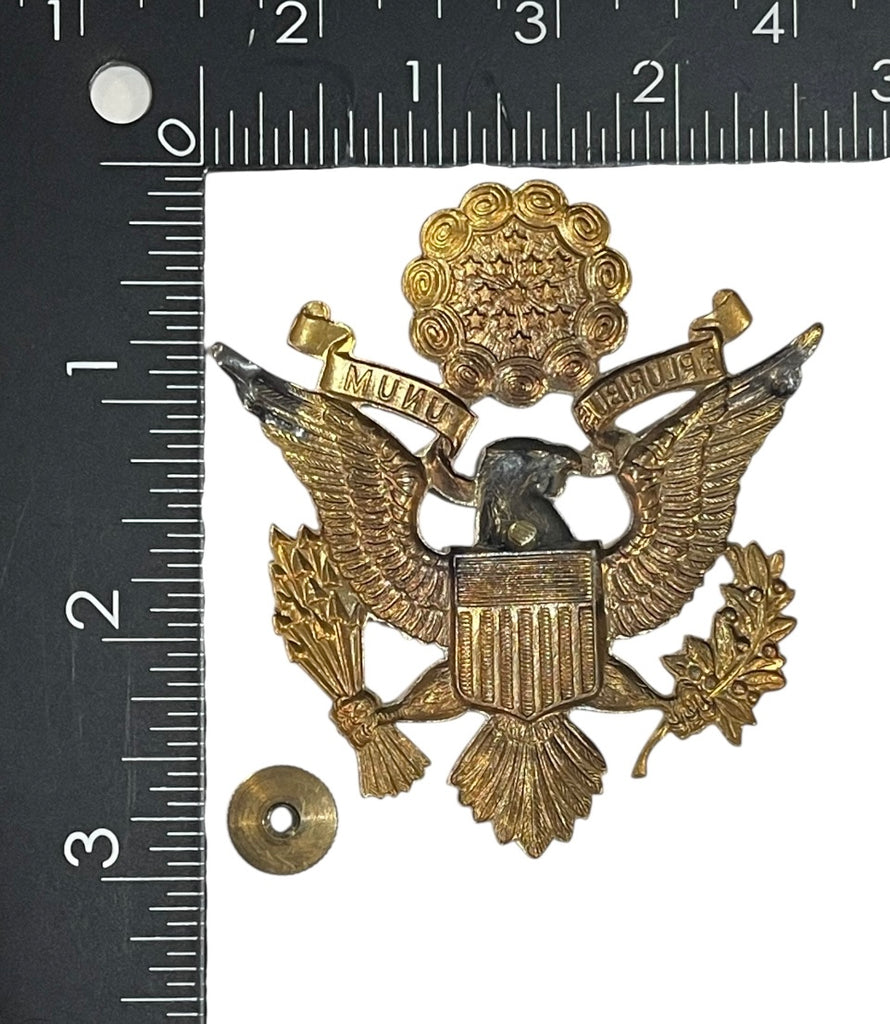 Used by the US Army and US Air Force. Age toned brass metal, with two small clutch pins (removed) and screw post fastener.