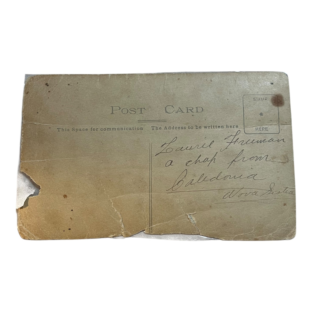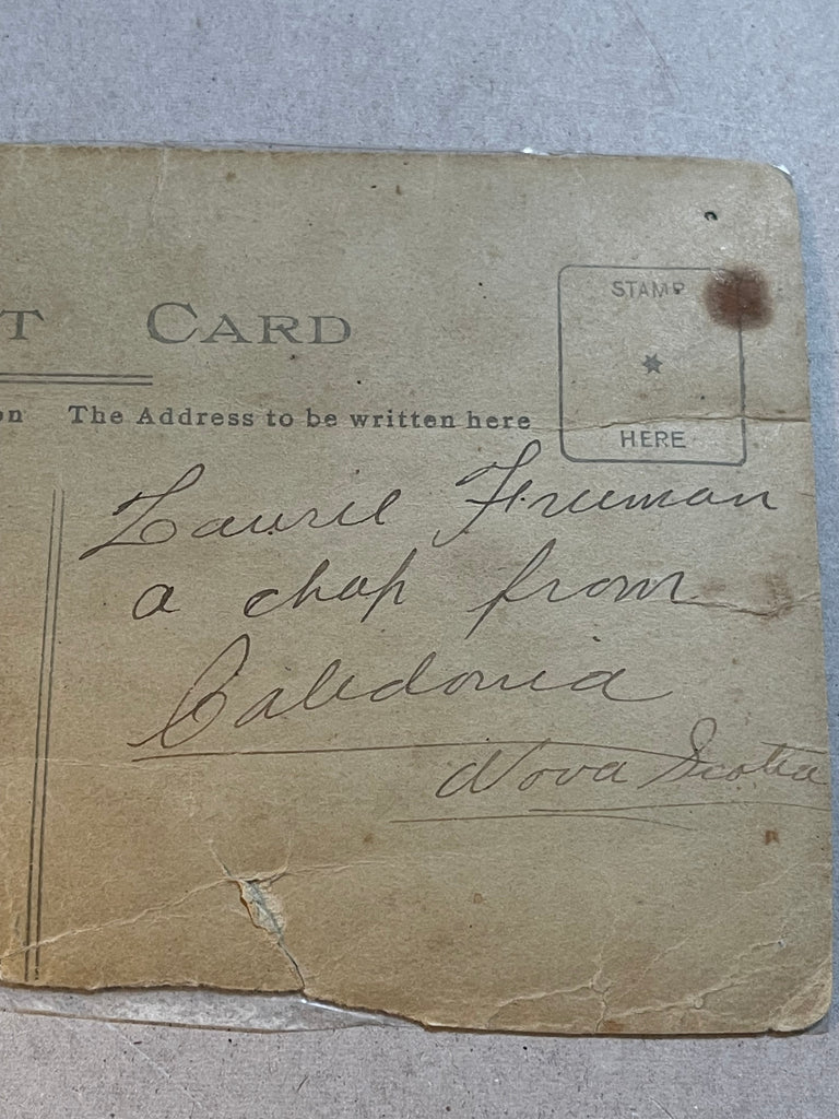 A well worn card, written on back, Laurie Freeman, a chap from Caladonia Nova Scotia. Tape covered, corners rounded, not postally used. This was an important postcard to someone.
