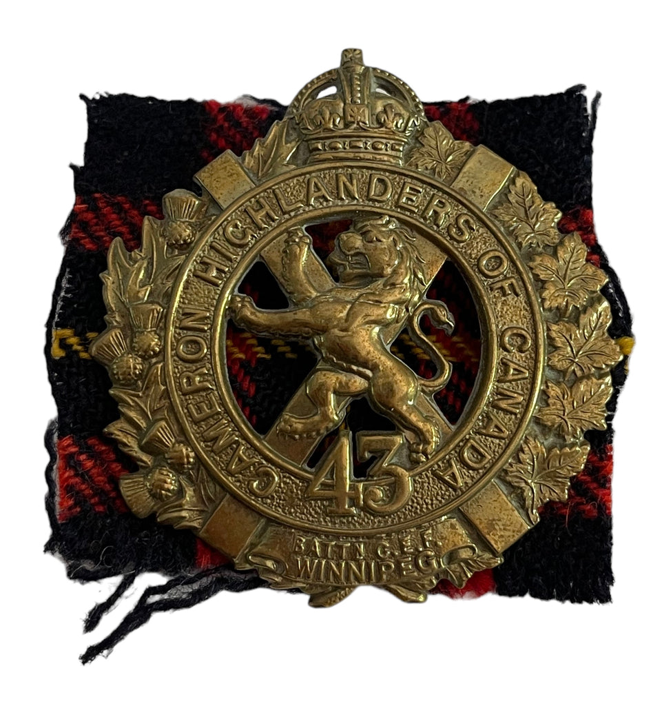 WW1 CEF 43rd Battalion Cap Badge on Tartan backing