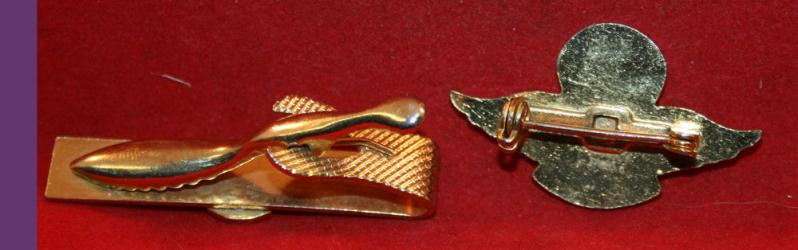 Pin and Tie Bar issued by, IRWIN Parachute Company, the gold plated IRWIN pin with pin fasteners. 1 3/8" wide, 13/16" high and a clasp type Tie Bar, 1 5/8", with the crest attached. These are post War issue. Excellent condition.