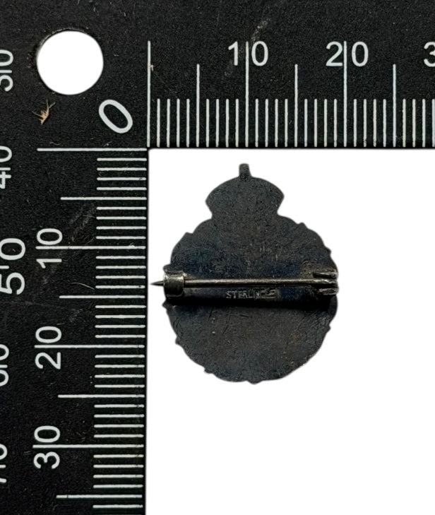 Sterling marked. Nice age toned with enamel. Pin back.