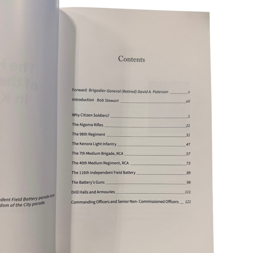 Published December 2025. Soft cover, 128 pages. Covers the early days of the Militia in thee area including, the Algoma Rifles, 98th Regiment, Kenora Light Infantry, 7th & 40th MED RCA, 116th Battery and more. Black and White pictures. Compiled and written by Bob Stewart and Robert Poirier.