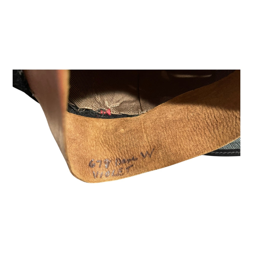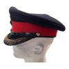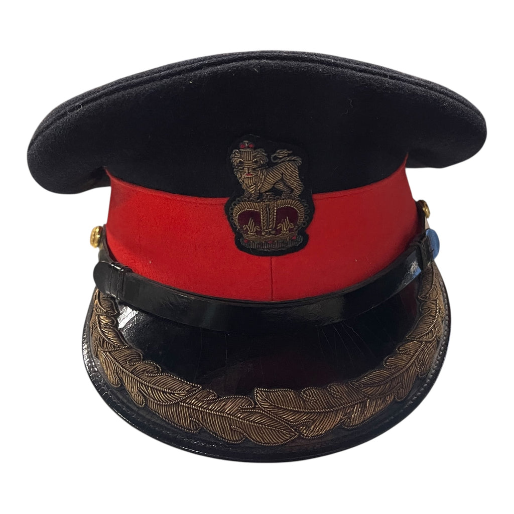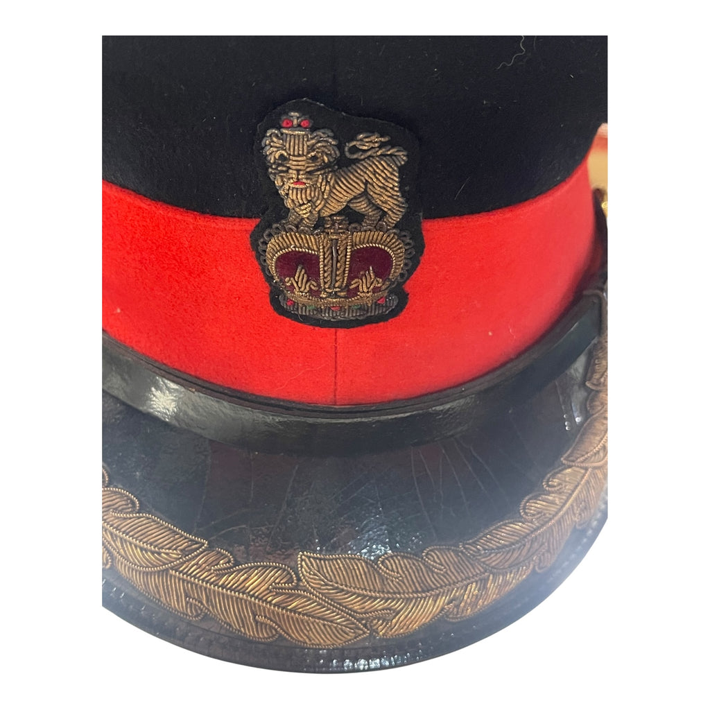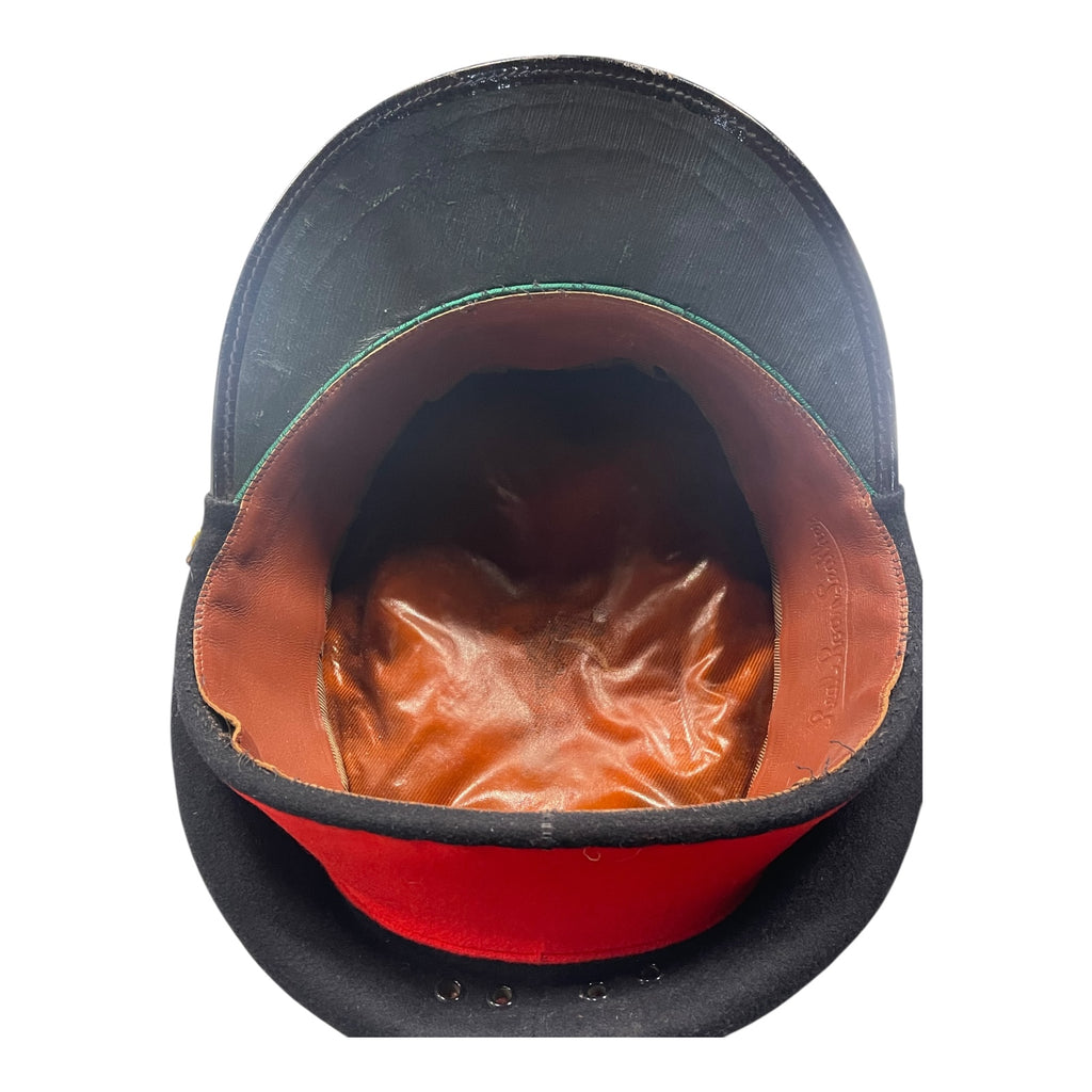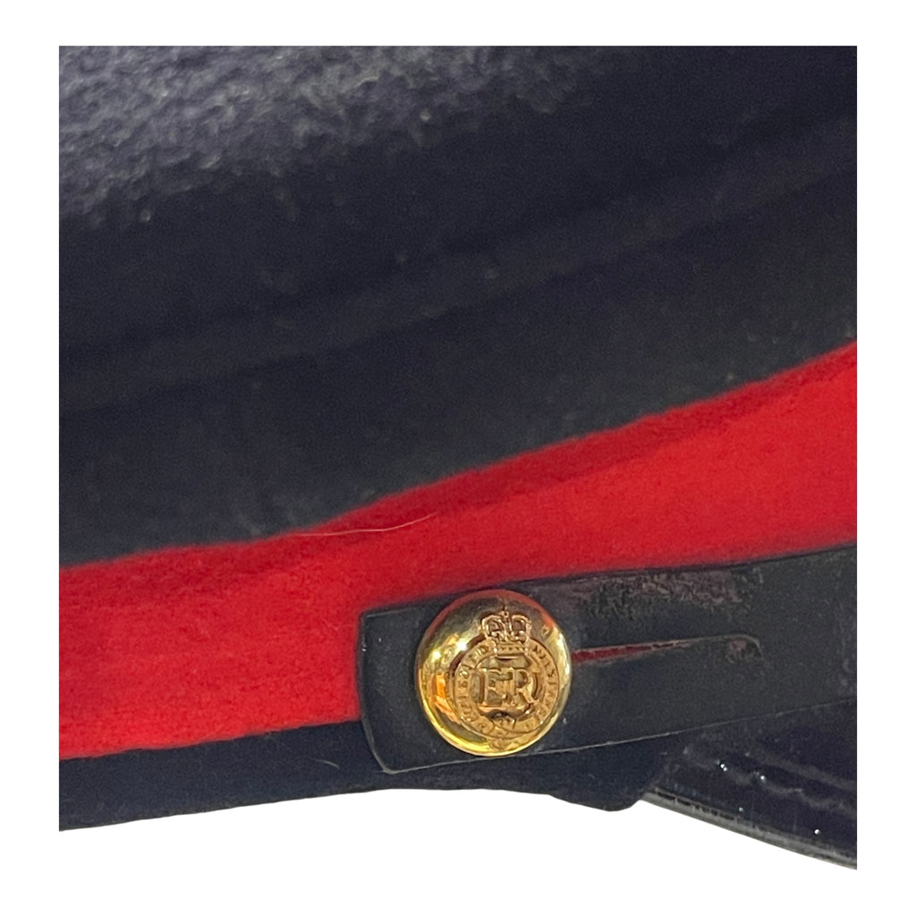 In very fine condition. With nice aged, gold wire brim. Has two piece officers buttons on each side. Sweat band is stamped, hat is stamped with manufactures information. Name written on backside of sweatband. Some loose stitching on sweatband. Post 1953.