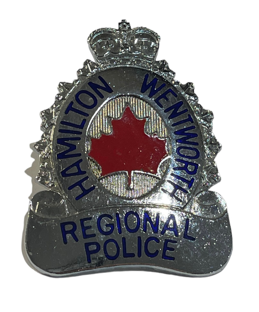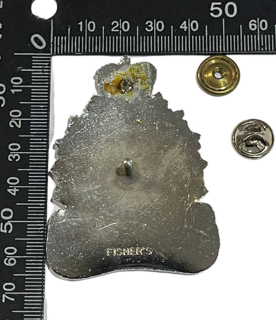 Chromed white metal badge with enamels. Screw post Fastener. Fishers maker stamped.
