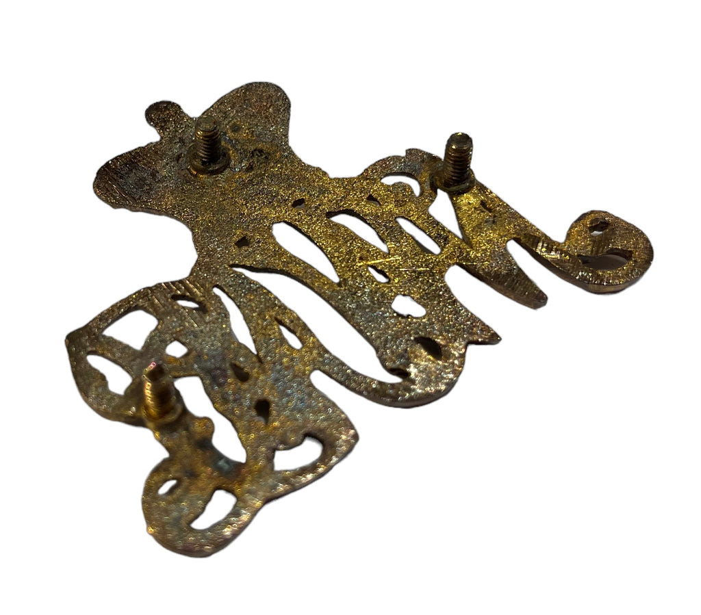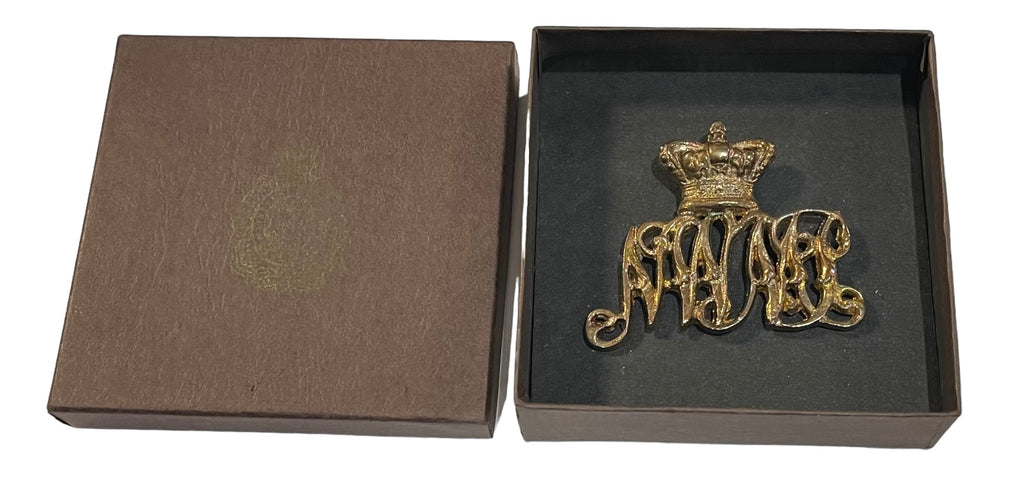 Brass metal with screw post fasteners. In Box, box has incorrect badge information. A decent made filler for you collection till an original pops up. Manufacturers tag on the reverse, under license from the Mounted Police Foundation.