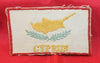 2 piece lot of cloth flashes related to Greek involvement in CYPRUS. First top banner, words, AYNAMEIZ KATAAPOMON, black on dull green cotton, dull gray cotton cloth backing, 1" high by 5 1/2" long. Second a rectangele, 2" x 3 1/4", with yellow thread Map of Cyprus over a dull blue green Leaf wreath over CYPRUS word in yellow, all on dull white cotton backing with thin red outer border, thin black paper cloth type backing. No idea what these might be for.