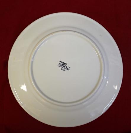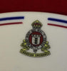 Off white with black, red and yellow regimental crest, with blue and red border. Maker stamped Syracuse China.Shows use, but has no cracks, chips or crazing. 8" wide.