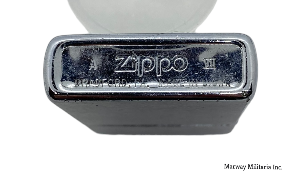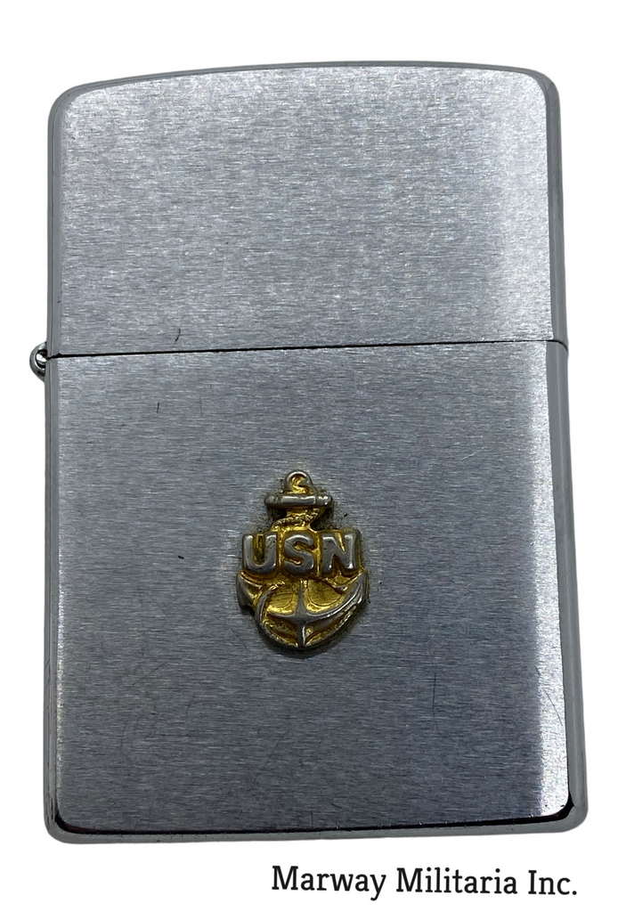 Typical zippo lighter with gold coloured USN decal affixed. Makes the typical zippo closing noise. No spark when you turn the wheel. Date coded to 1991.