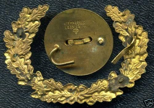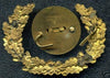 Belgium Police Cap badge. 2 piece, with dull gold coated 3/4 wreath showing slight age dulling spots, 2" x 1 3/8", with single folding wire fastener remaining. In centre a circle disk, in dull gold with green enamel domed backing and dull gold Coat of Arms attached. Single wire fastener remaining, 1" across. Shows age dulling but still nice.