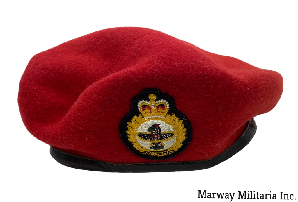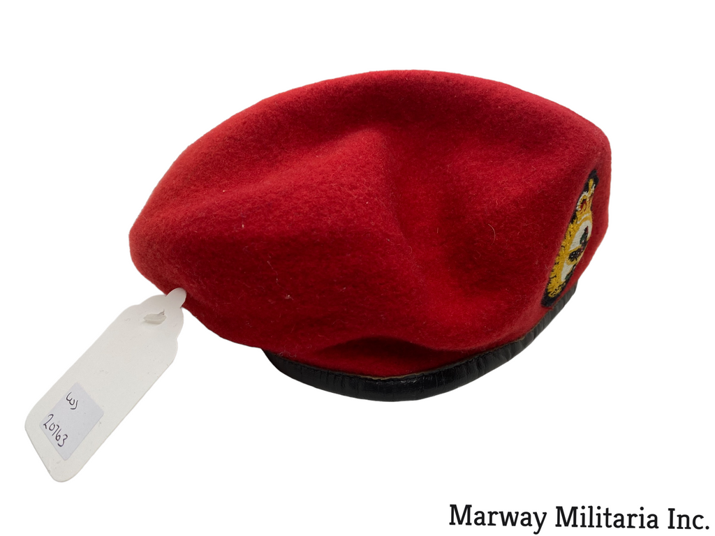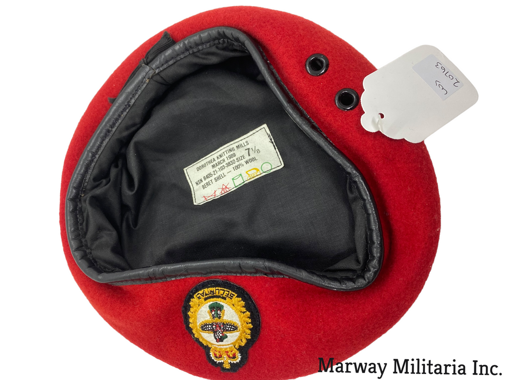 Leather Banded red wool beret by Dorothea Knitting Mills Sized 7 1/8. In very good, hardly used condition. Dated March 1989.