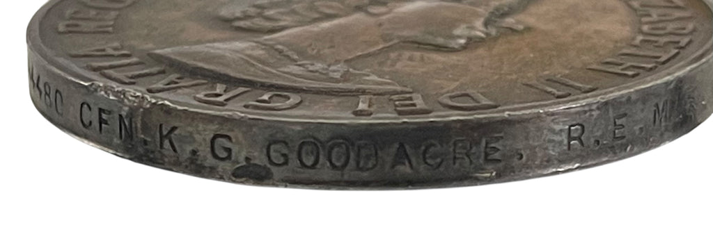Full size, with ribbon. Genuine. Impressed along the edge 23544480 CFN. K.G. GOODACRE REME Some edge marks.