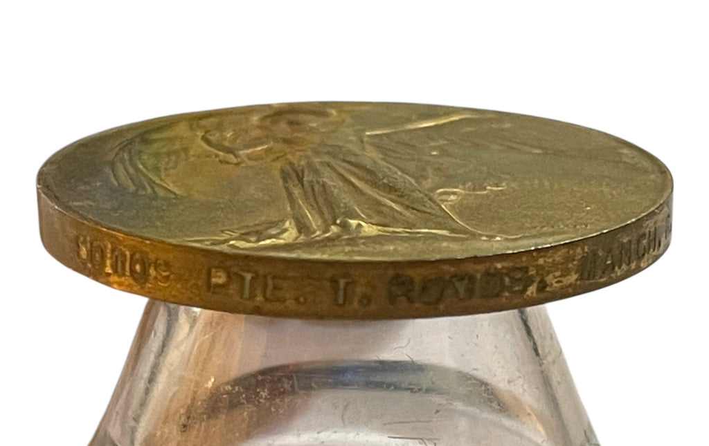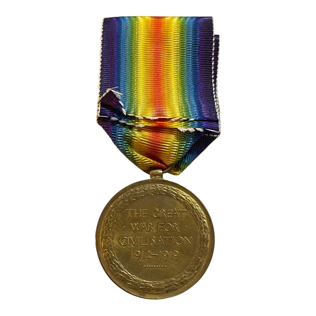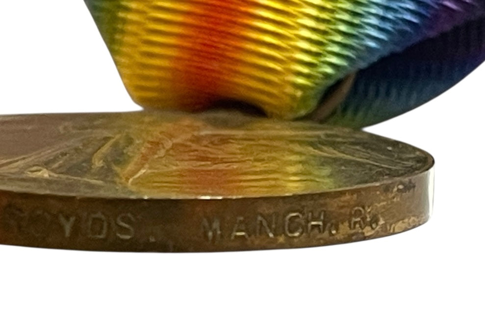 Brass Victory medal, with issued ribbon. Impressed along edge 60109 PTE. T. ROYDS MANCH.R. (Manchester Regiment). No research completed.