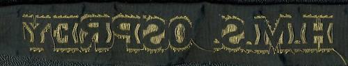 H.M.S. OSPREY Navy Cap Tally. Full length (approx 30 inches), was tied. Dull Gold lettering on black. showing some age fading.